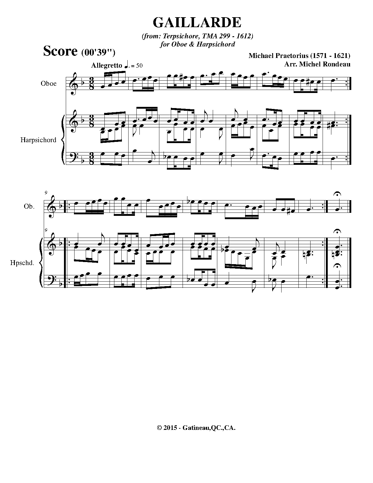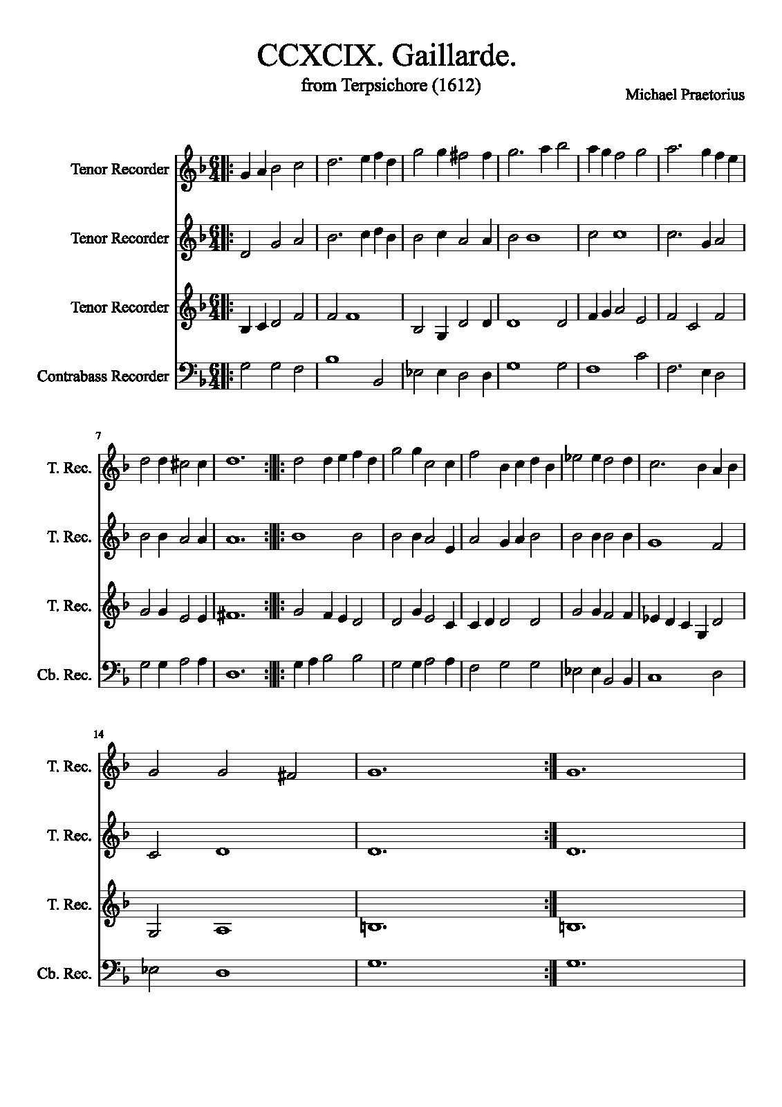 | Extra Information | These pieces were assembled and arranged by Praetorius for his 1612 collection. It is unknown how many, or if any, of the works in the collection were actually composed by Praetorius as opposed to being popular dance tunes arranged by him. The instrumentation is not specified in the original, and simply listed as "à 4". |