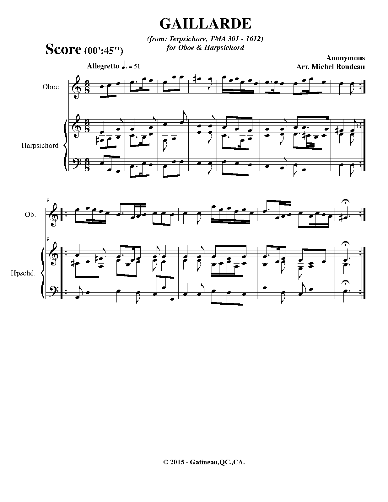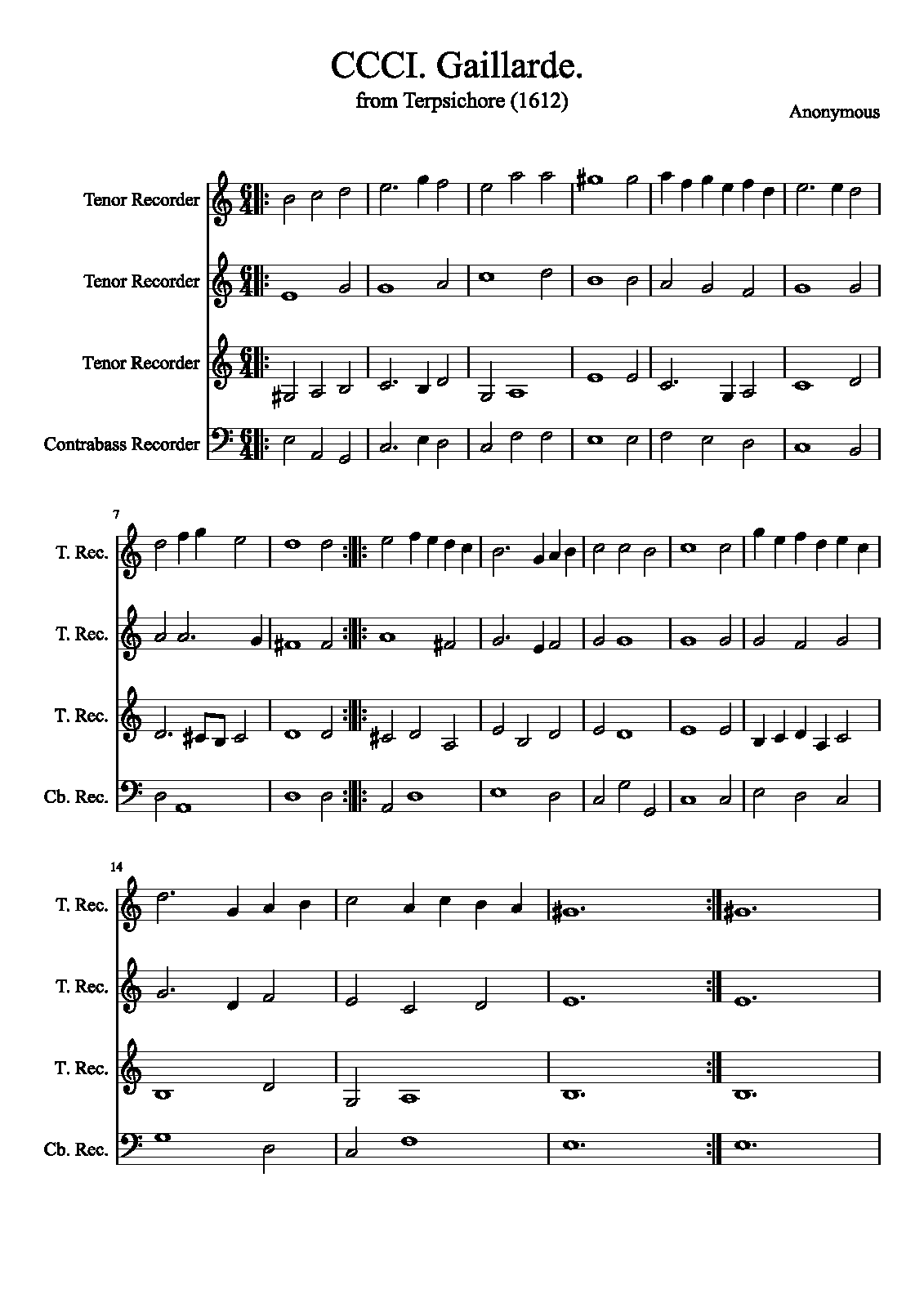| Extra Information | These pieces were assembled and arranged by Praetorius for his 1612 collection. It is unknown how many, or if any, of the works in the collection were actually composed by Praetorius as opposed to being popular dance tunes arranged by him. The instrumentation is not specified in the original, and simply listed as "à 4". |