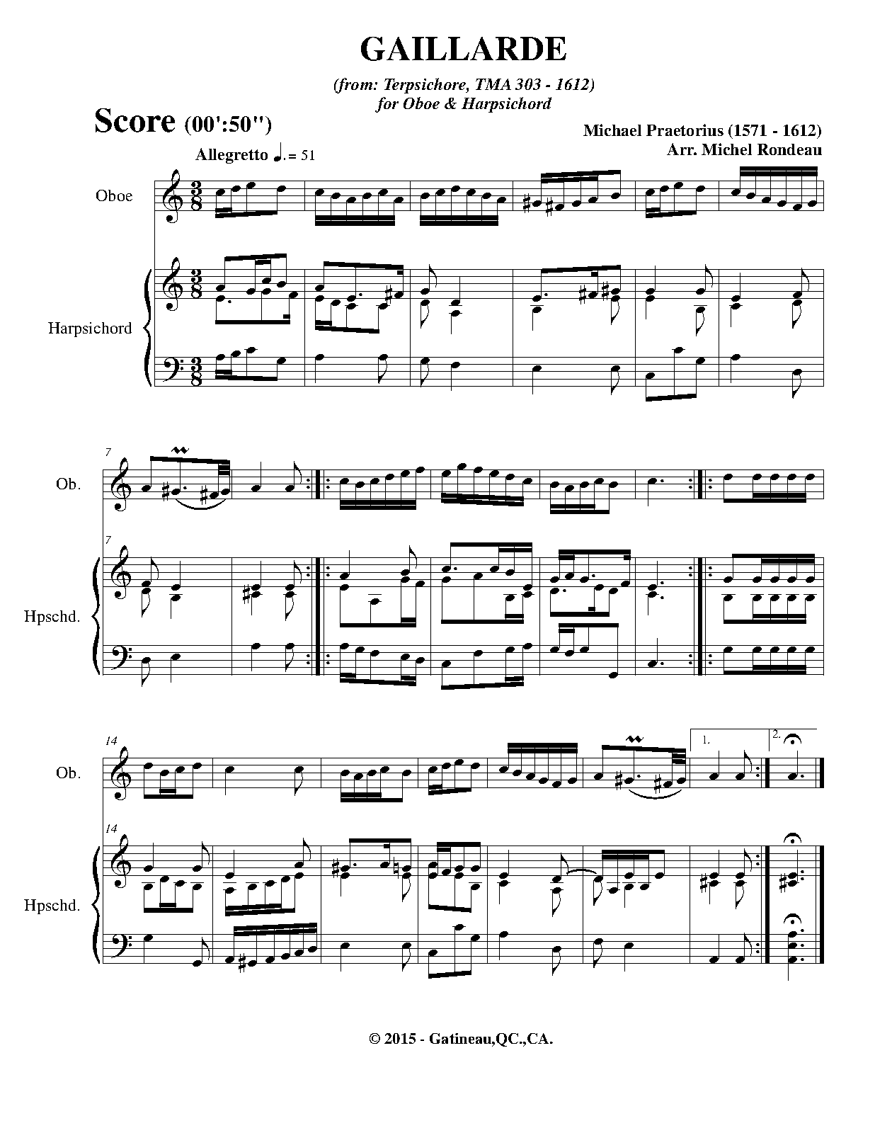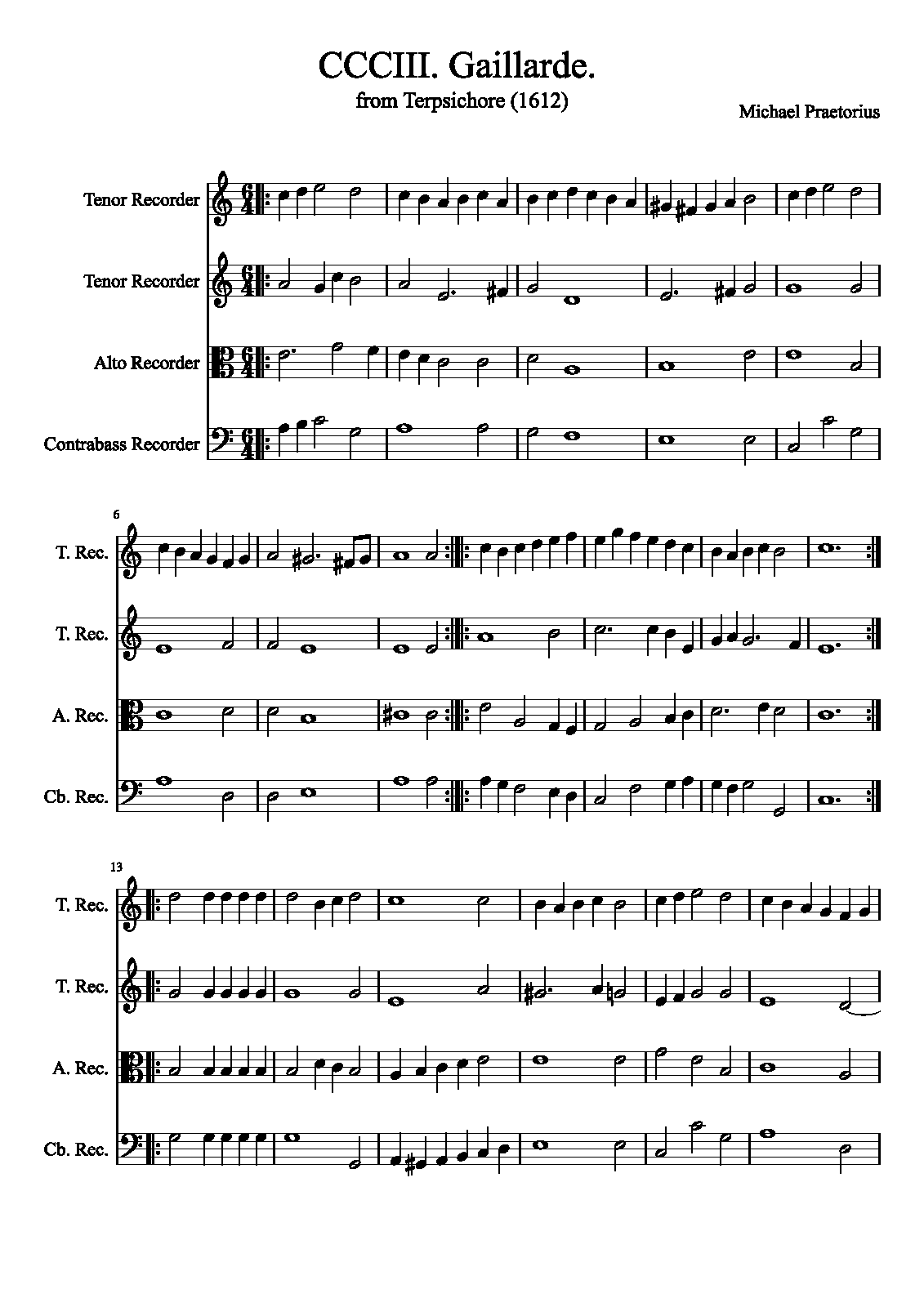 | Extra Information | These pieces were assembled and arranged by Praetorius for his 1612 collection. It is unknown how many, or if any, of the works in the collection were actually composed by Praetorius as opposed to being popular dance tunes arranged by him. The instrumentation is not specified in the original, and simply listed as "à 4". |