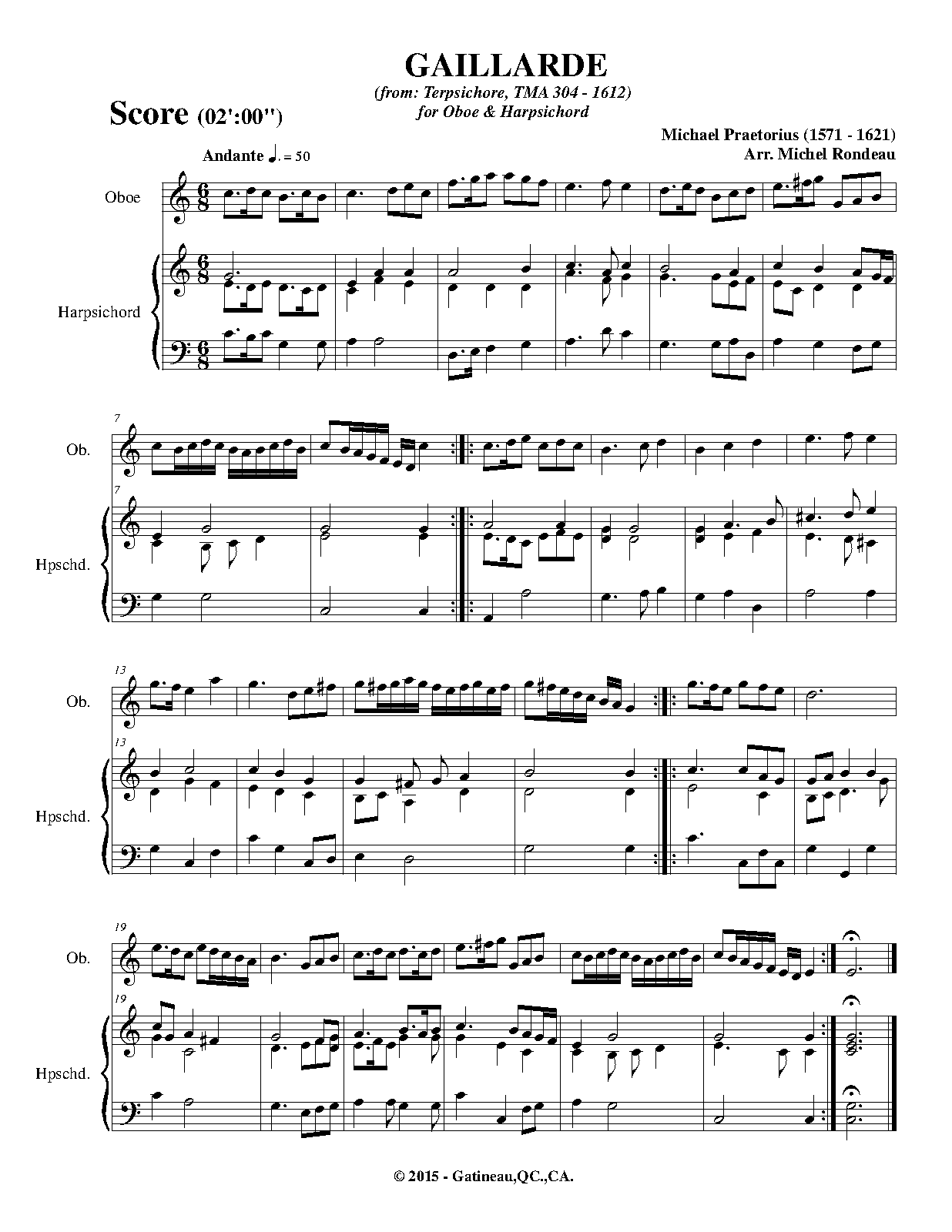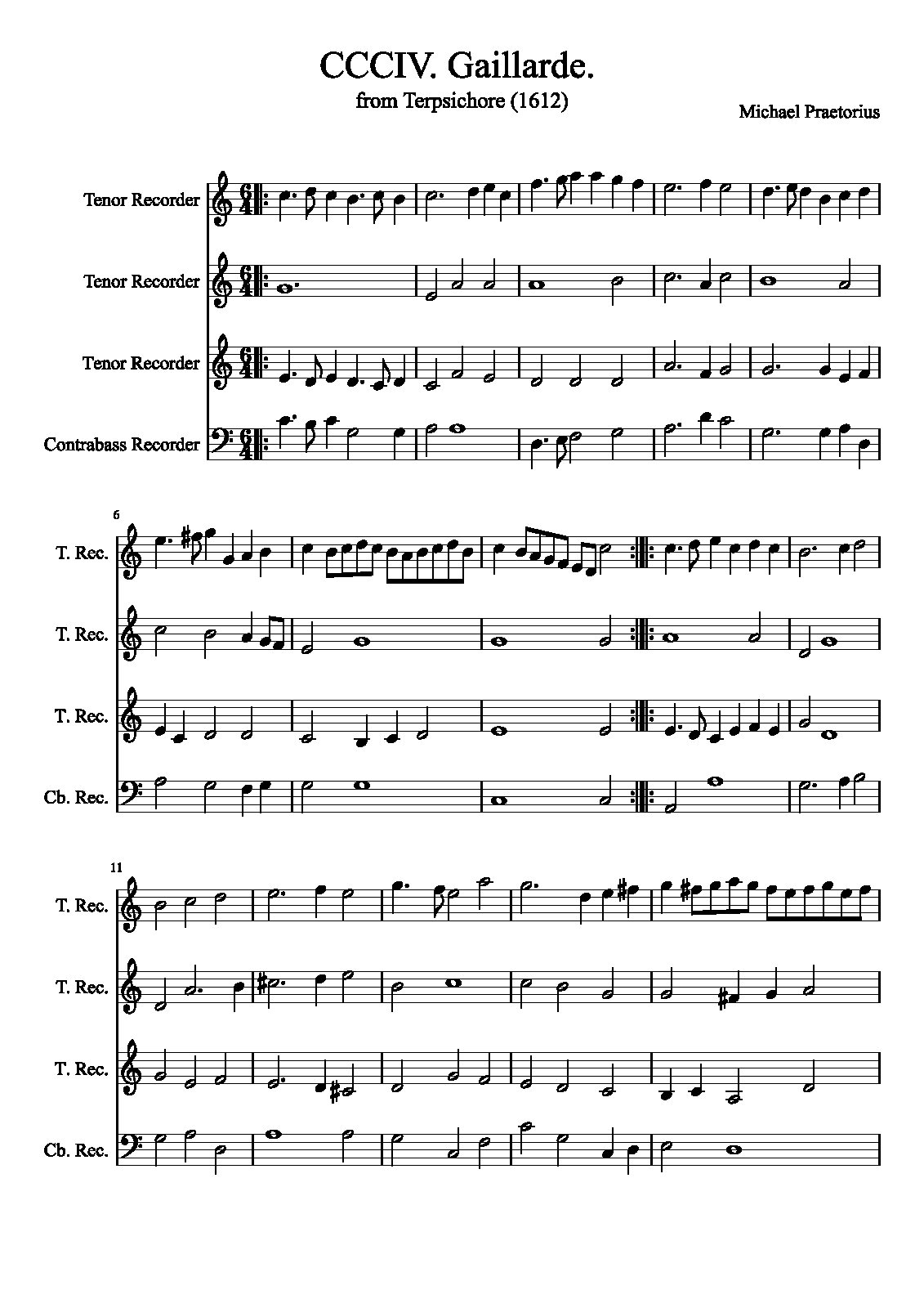 | Extra Information | These pieces were assembled and arranged by Praetorius for his 1612 collection. It is unknown how many, or if any, of the works in the collection were actually composed by Praetorius as opposed to being popular dance tunes arranged by him. The instrumentation is not specified in the original, and simply listed as "à 4". |