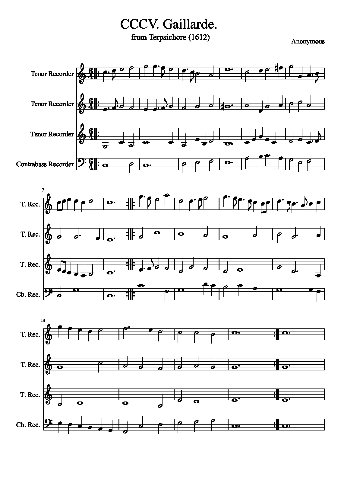 | Extra Information | These pieces were assembled and arranged by Praetorius for his 1612 collection. It is unknown how many, or if any, of the works in the collection were actually composed by Praetorius as opposed to being popular dance tunes arranged by him. The instrumentation is not specified in the original, and simply listed as "à 4". |
