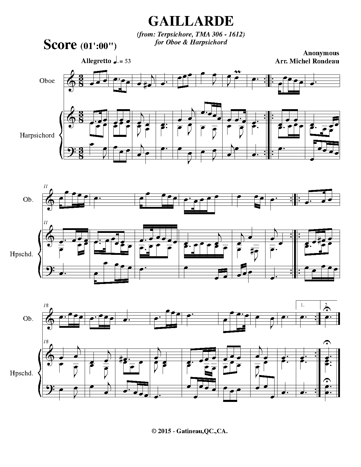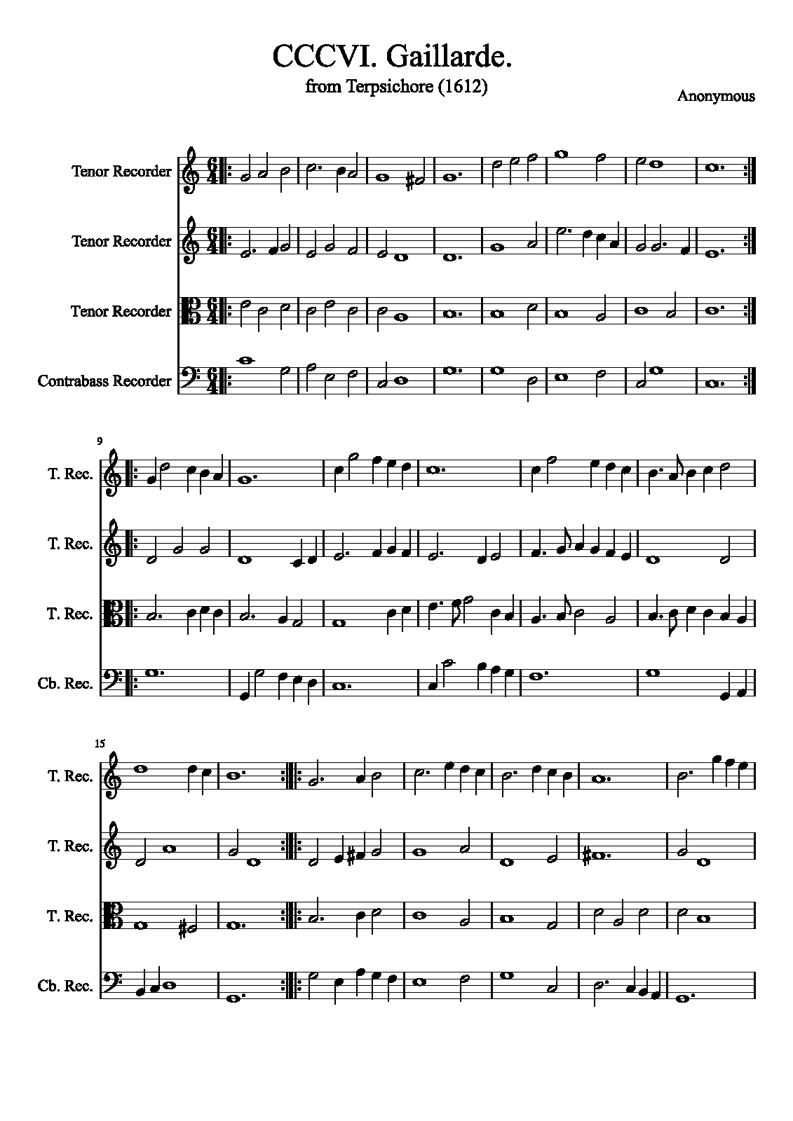 | Extra Information | These pieces were assembled and arranged by Praetorius for his 1612 collection. It is unknown how many, or if any, of the works in the collection were actually composed by Praetorius as opposed to being popular dance tunes arranged by him. The instrumentation is not specified in the original, and simply listed as "à 4". |