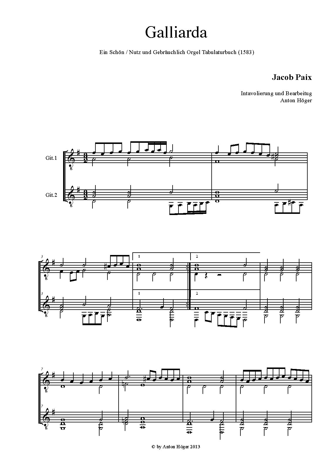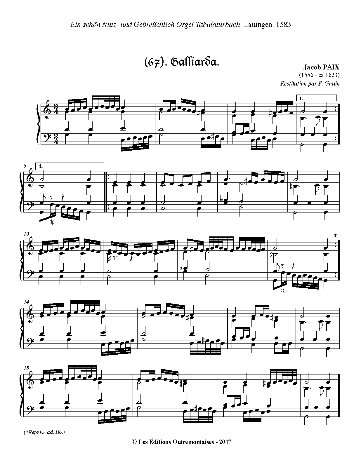 | First Publication | 1583, Lauingen, in Ein Schön Nutz unnd Gebreüchlich Orgel Tabulaturbüch (Paix, Jakob) (no.67) |