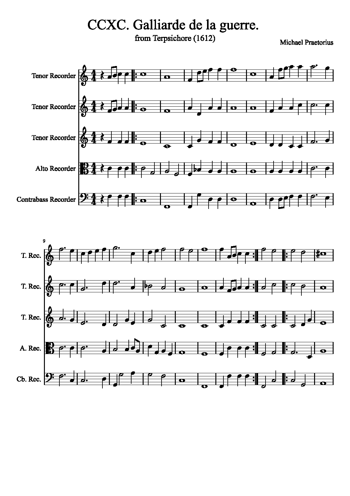 | Extra Information | These pieces were assembled and arranged by Praetorius for his 1612 collection. It is unknown how many, or if any, of the works in the collection were actually composed by Praetorius as opposed to being popular dance tunes arranged by him. The instrumentation is not specified in the original, and simply listed as "à 5". |