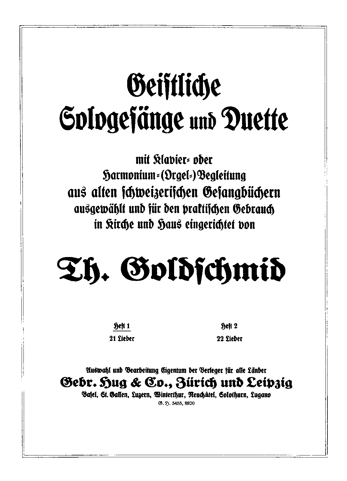 | Alternative. Title | Geistliche Sologesänge und Duette mit Klavier- oder Harmonium- (Orgel-) Begleitung aus alten schweizerischen Gesangbüchern ausgewählt und für den praktischen Gebrauch in Kirche und Haus eingerichtet von Theodor Goldschmid |