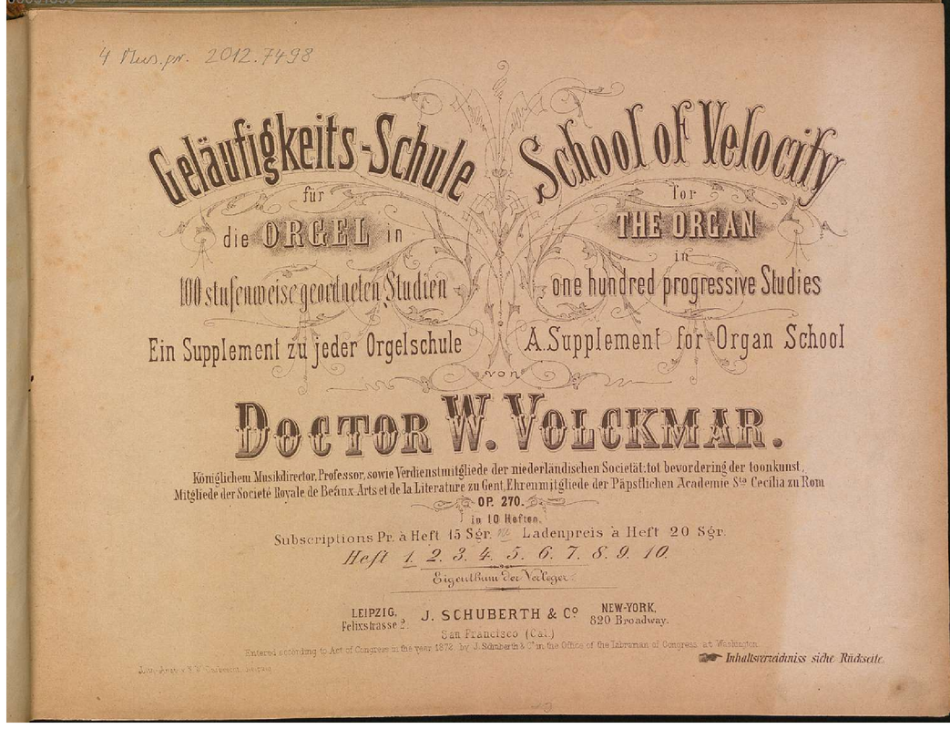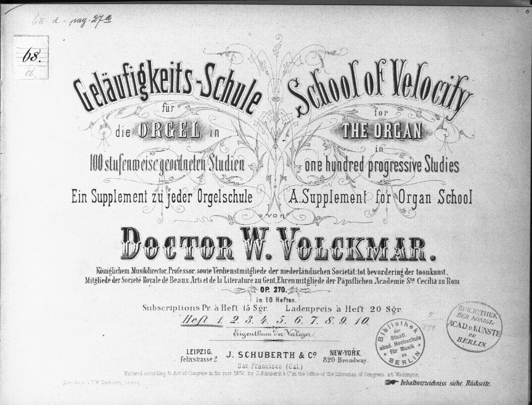 | Alternative. Title | Geläufigkeits-Schule für die Orgel, in 100 stufenweise geordneten Studien; ein Supplement zu jeder Orgelschule School of Velocity for the Organ |