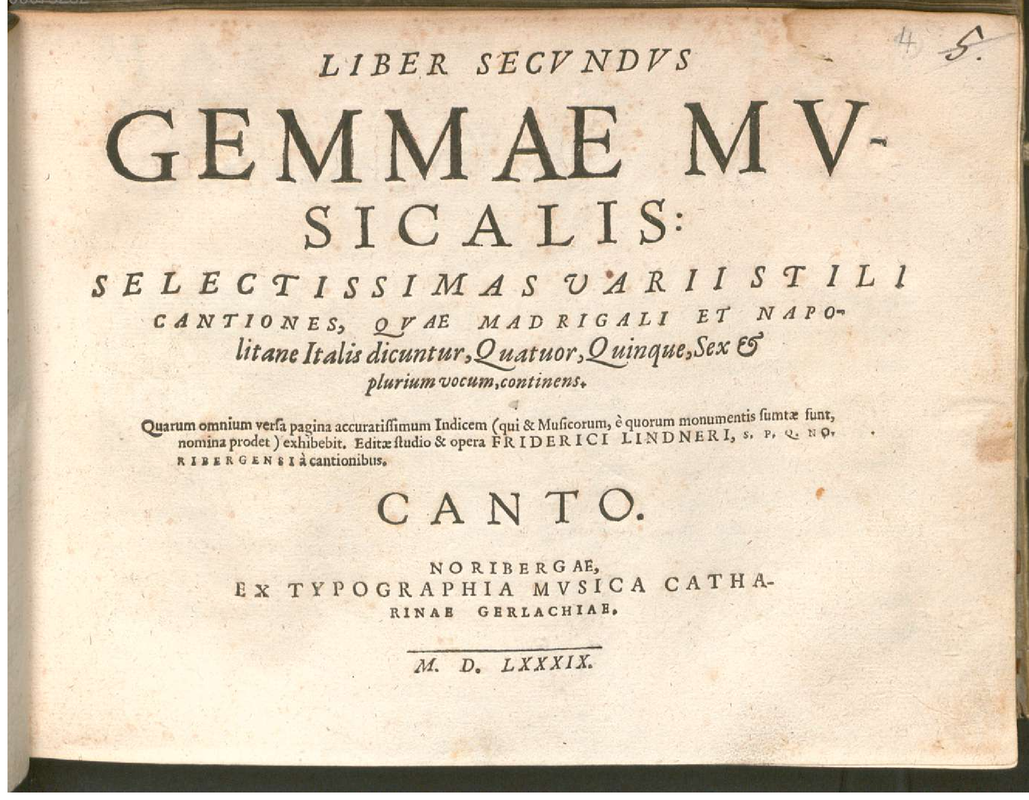 | Alternative. Title | Liber Secundus Gemmae Musicalis: selectissimas varii stili cantiones, quae madrigali et napolitane Italis dicuntur, quatuor, quinque, sex & plurium vocum, continens |