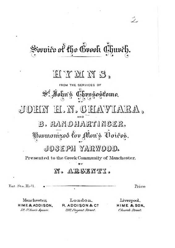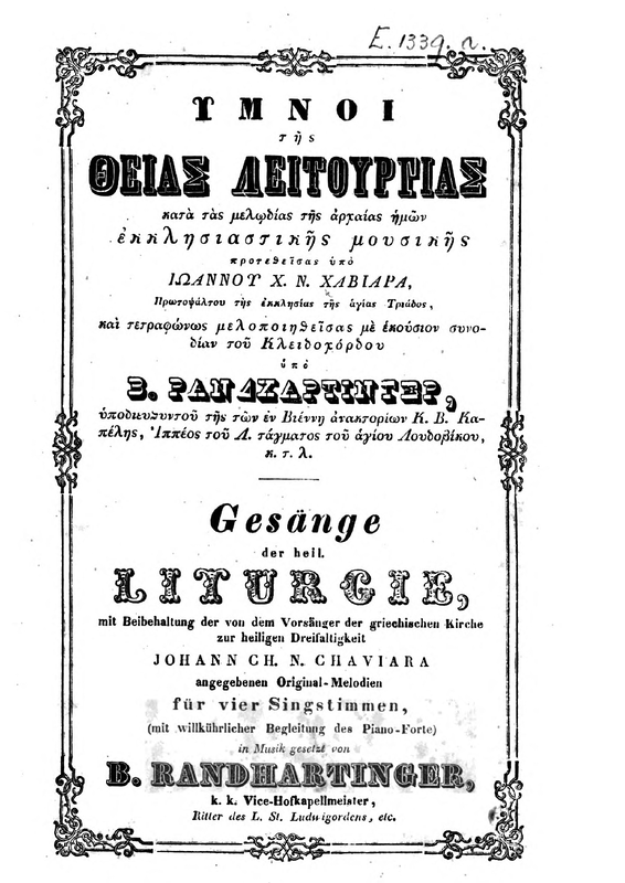 | Alternative. Title | Υμνοι τής Θειας Λειτουργιας κατά τάς μελώδίας τής άρχαίας ήμών έκκλησιαστικής μουσικής ... ; Umnoi tes theias leitourgias kata tas melodias tes archaias hemon ekklesiastikes mousikes protetheisas hupo Ioannou Ch. N. Chabiara ... kai tetraphonos melopoitheisas me hekousion sunodian tou kleidochordou hupo B. Randhartinger Gesänge der heiligen Liturgie, mit Beibehaltung der von dem Vorsänger der griechischen Kirche zur heiligen Dreifaltigkeit Johann Ch. N. Chaviara angegebenen Original-Melodien für vier Singstimmen, (mit willkührlicher Begleitung des Piano-Forte) in Musik gesetzt von B. Randhartinger |