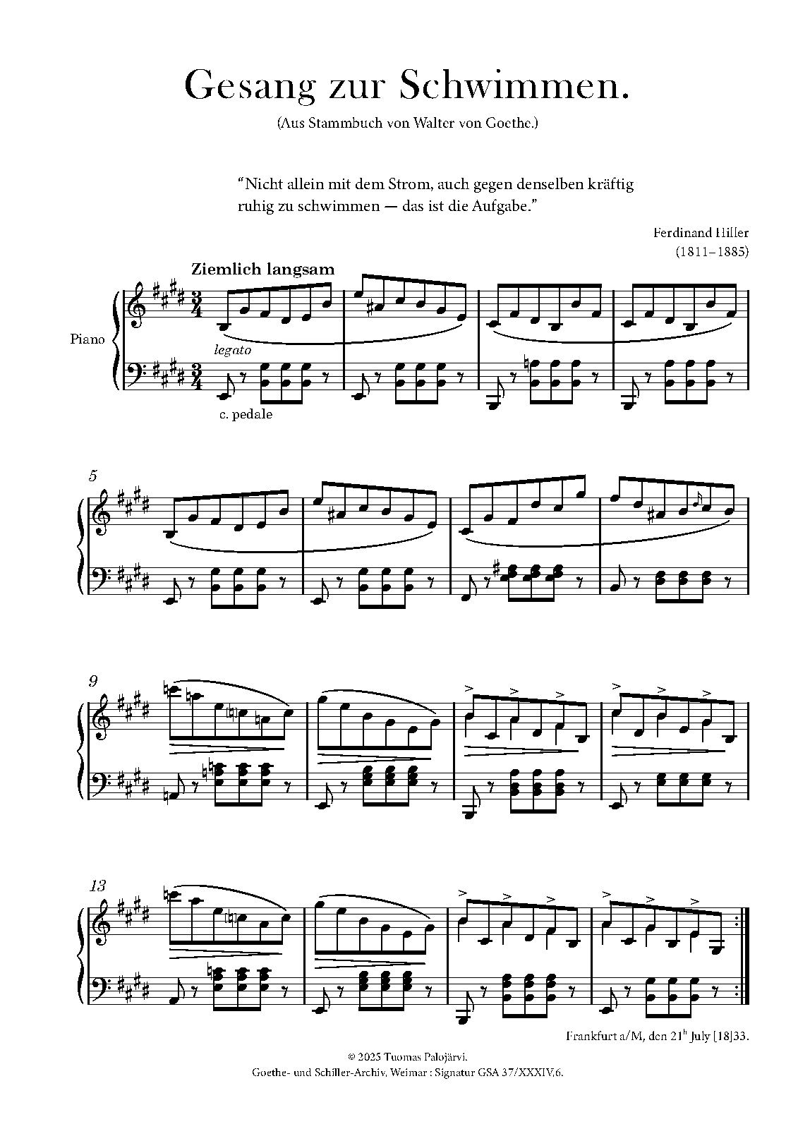 | Extra Information | Autograph in the album of Walther von Goethe, at the Goethe- und Schiller-Archiv, Weimar. Hiller's albumleaf includes a short poem: "Nicht allein mit dem Strom, auch gegen denselben kräftig ruhig zu schwimmen — das ist die Aufgabe." |