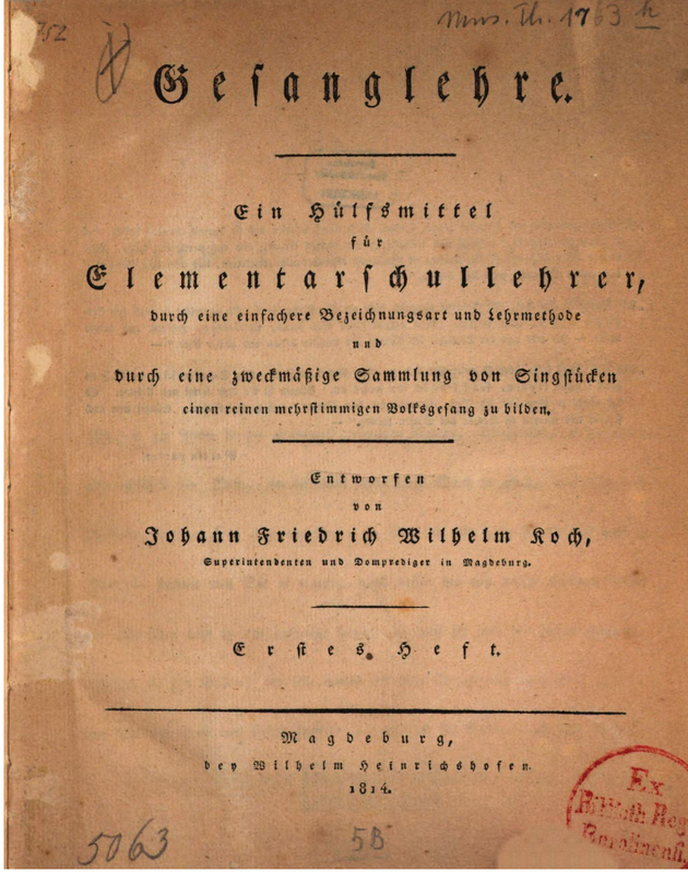 Gesanglehre. Ein Hülfsmittel für Elementarschullehrer, durch eine einfachere Bezeichnungsart und Methode und durch eine zweckmäßige Sammlung von Singstücken einen reinen mehrstmmigen Volksgesang zu bilden.