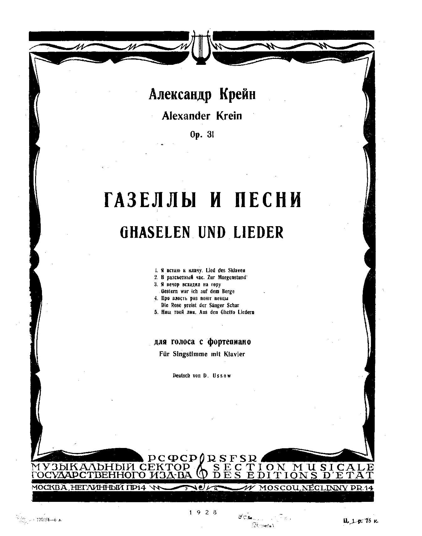 First edition in 1922 by GMI (State Music Publishers), and Nos.1 and 5 were published separately by Jibneh. 1922 edition only includes Russian texts. In 1928, GMI reprinted this work and this reprinted edition includes German translations (without Hebrew texts).