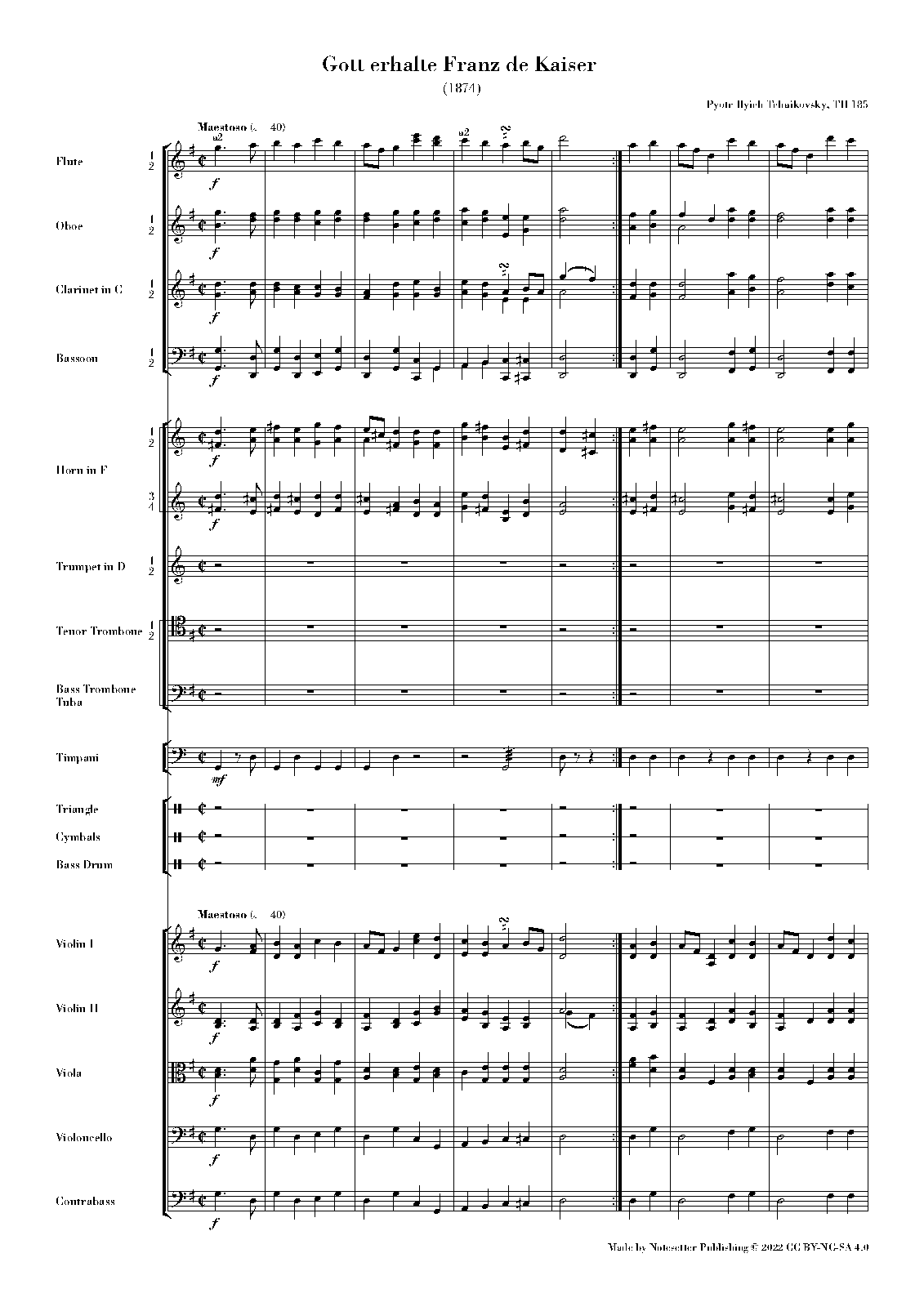 Instrumentation Orchestra: 2 flutes, 2 oboes, 2 clarinets (C), 2 bassoons, 4 horns (F), 2 trumpets (D), 2 tenor trombones, bass trombone, tuba, timpani, triangle, cymbals, bass drum, strings