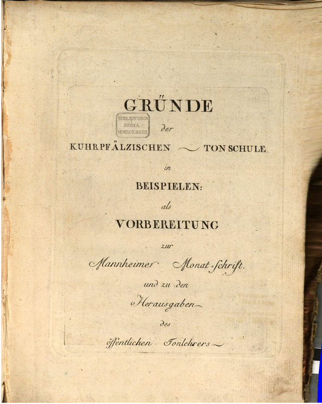 | Alternative. Title | Grunde der Kuhrpfälzischen Tonschule in Beyspielen als Vorbereitung zur Mannheimer Monatschrift und zu den Herausgaben des öffentlichen Tonlehrers Abt Vogler. |