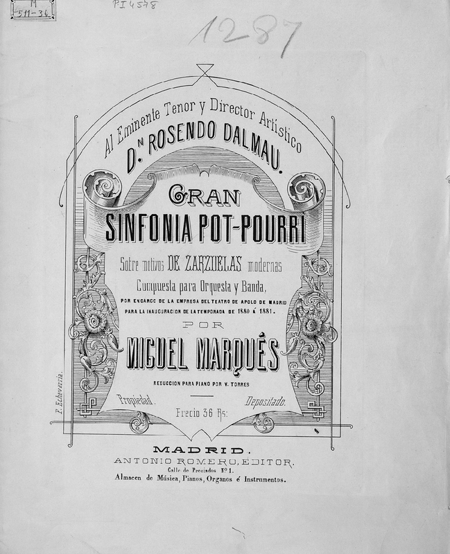 | Alternative. Title | Gran sinfonía pot-pourri sobre motivos de zarzuelas modernas compuesta para orquesta y banda por encargo de la empresa del Teatro Apolo de Madrid para la inaguración de la temporada 1880 á 1881 |