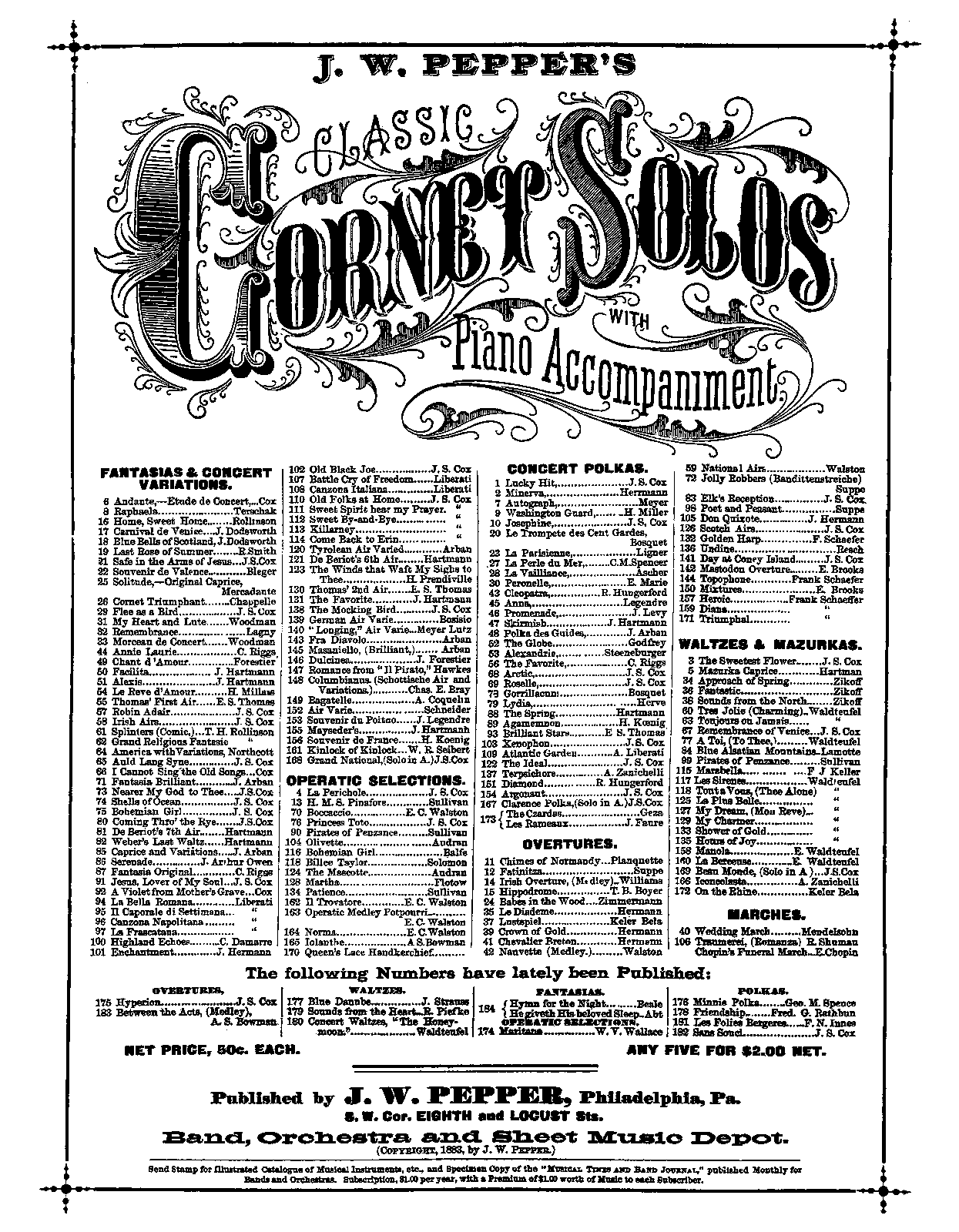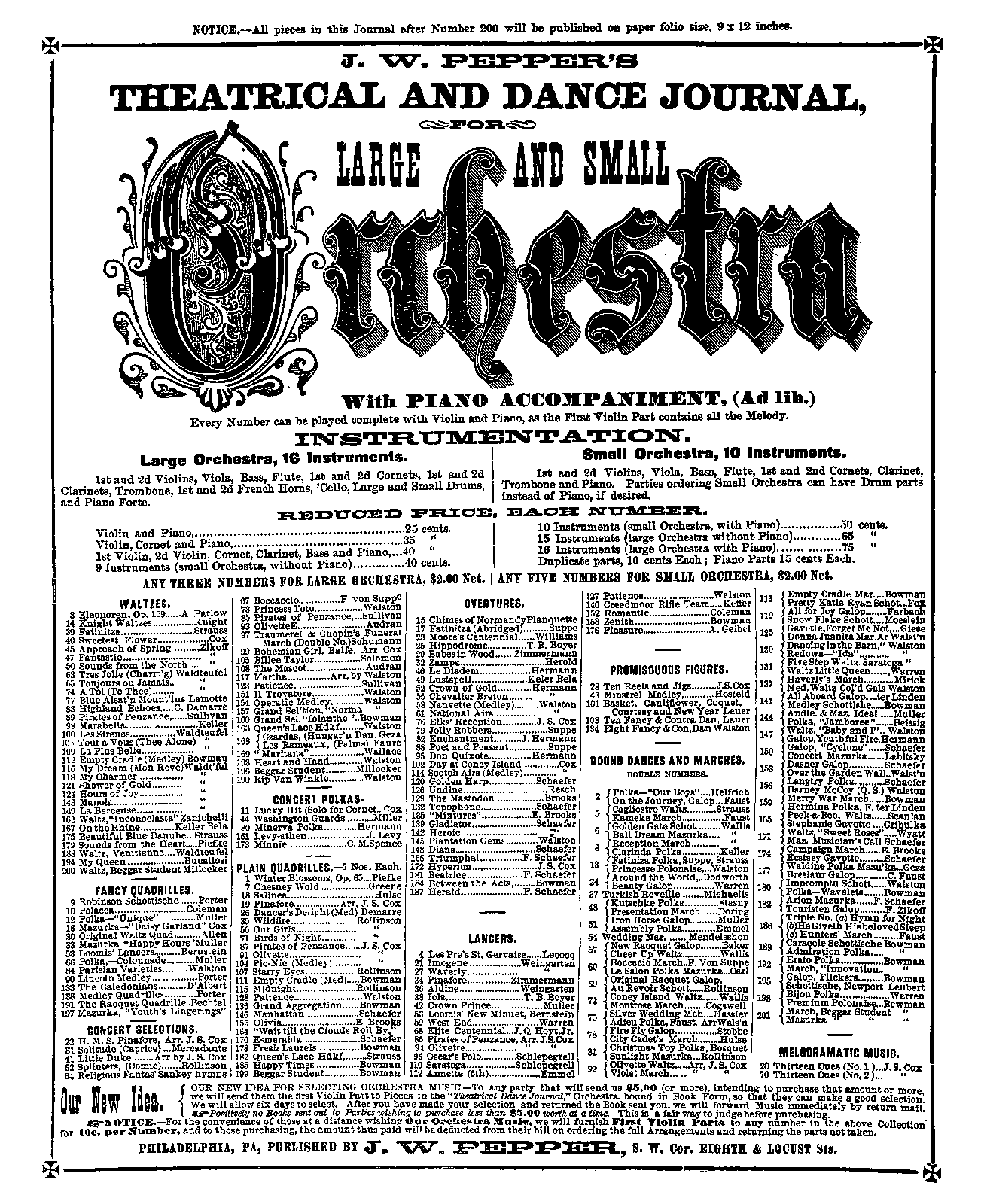 As published the work could also be performed with a smaller orchestra consisting of first and second violins, viola, bass, flute, clarinet, first and second cornets, trombone, and piano (ad lib.).
