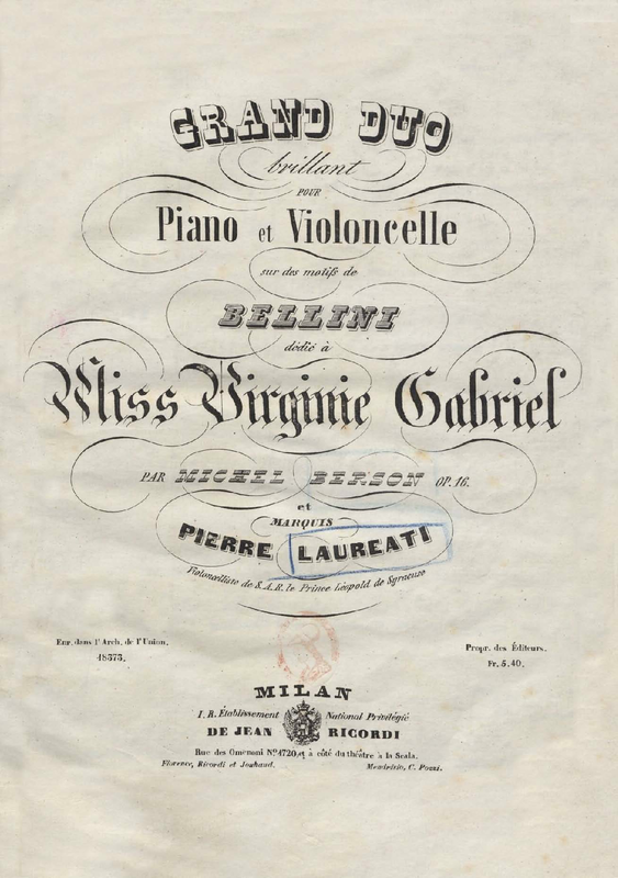 Written together with Marquis Pierre Laureati, (violoncelliste de S.A.R. le Prince Leopold de Syracuse).