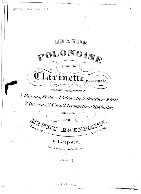 Has the same opus number as the Fantaisie pour clarinette et orchestre, Oeuv. 26 by H. Bärmann listed in the October 1824 AMZ supplement, and seems to have been published around the same time. This however seems to be a different work, published by Breitkopf und Härtel (plate 3932 parts), with trombones in its orchestration according to catalog card entries, and dedicated to A.B. Fürstenau (and in the key of F, according to an RISM entry that exists for a copy of it.)