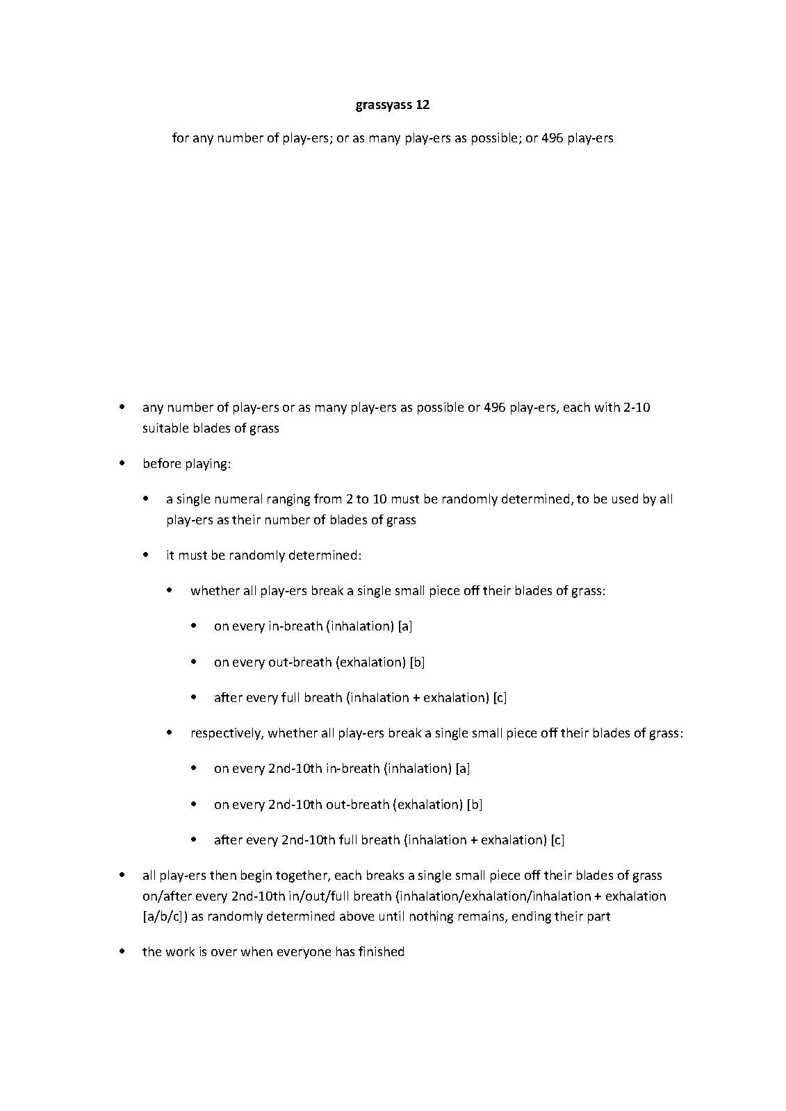 | Instrumentation | any number of play-ers or as many play-ers as possible or 496 play-ers, each with 2-10 suitable blades of grass |