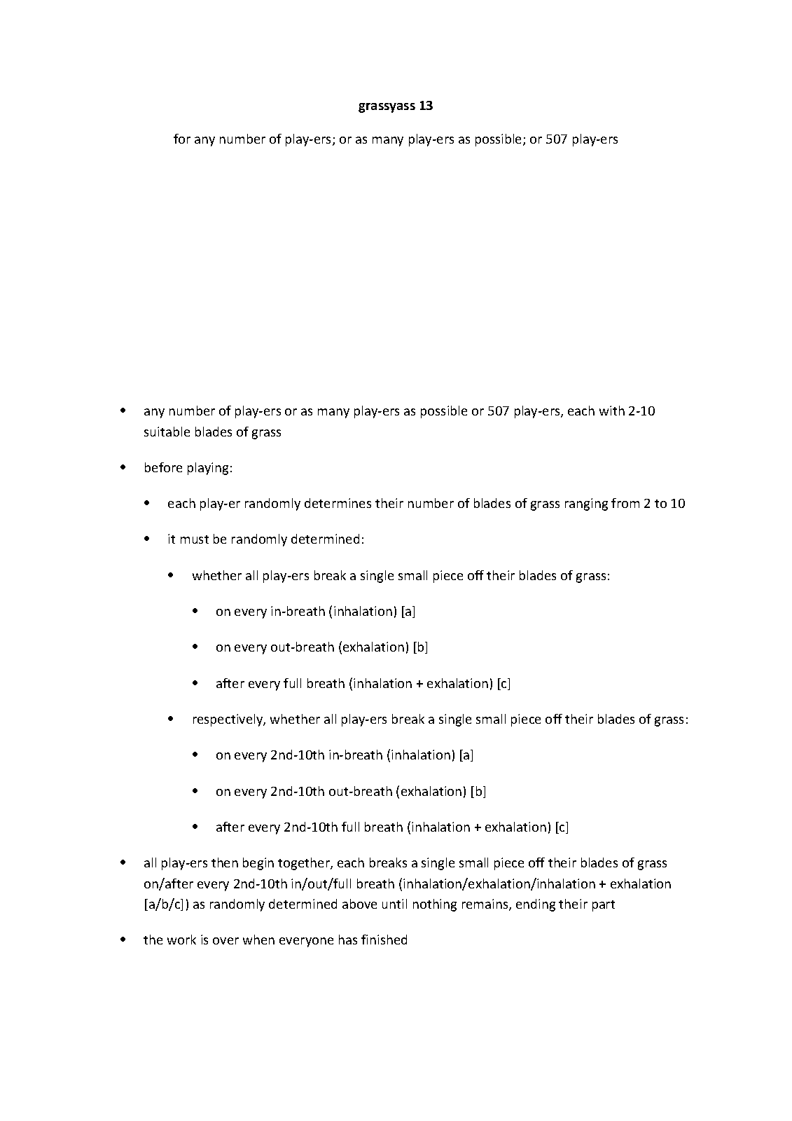| Instrumentation | any number of play-ers or as many play-ers as possible or 507 play-ers, each with 2-10 suitable blades of grass |