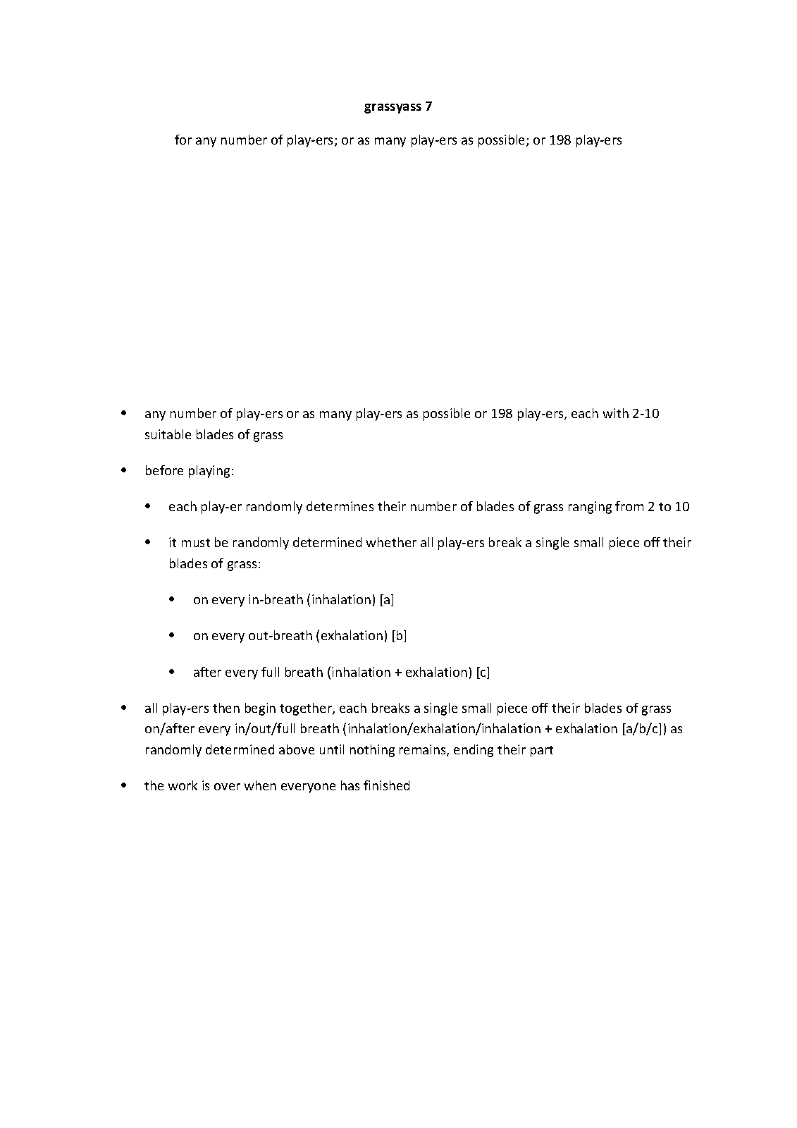 | Instrumentation | any number of play-ers or as many play-ers as possible or 198 play-ers, each with 2-10 suitable blades of grass |