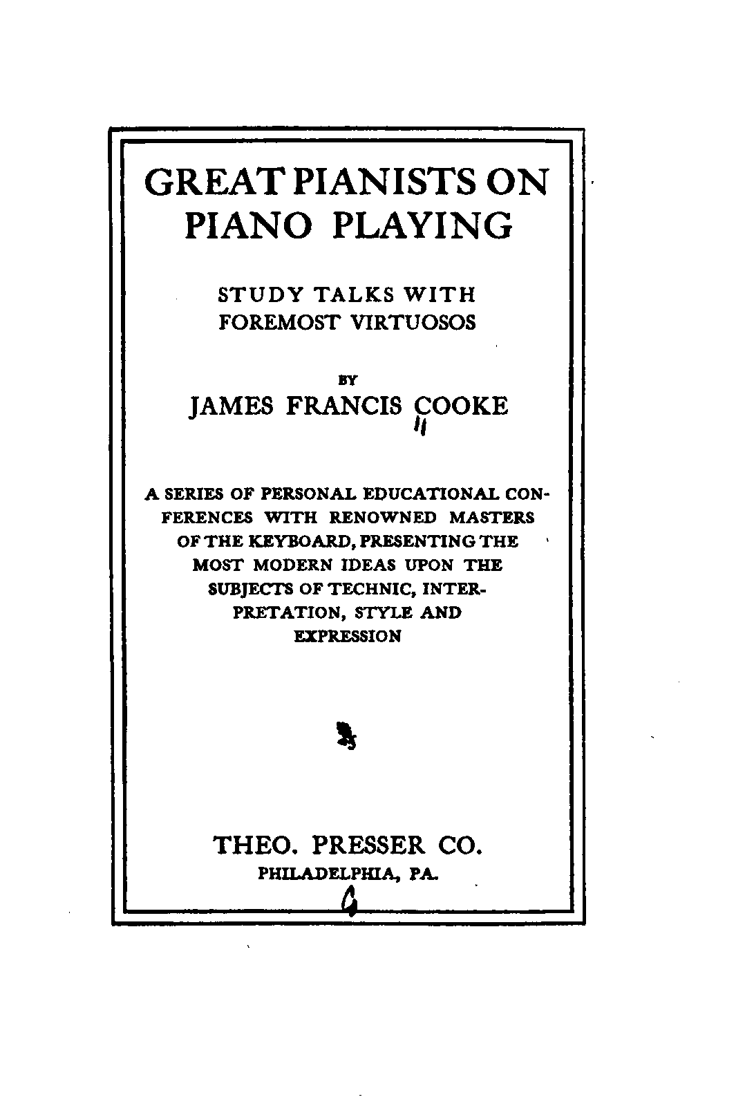 Great Pianists on Piano Playing: Study Talks with Foremost Virtuosos. A Series of Personal Educational Conferences with Renowned Masters of the Keyboard, Presenting the Most Modern Ideas upon the Subjects of Technic, Interpretation, Style and Expression.