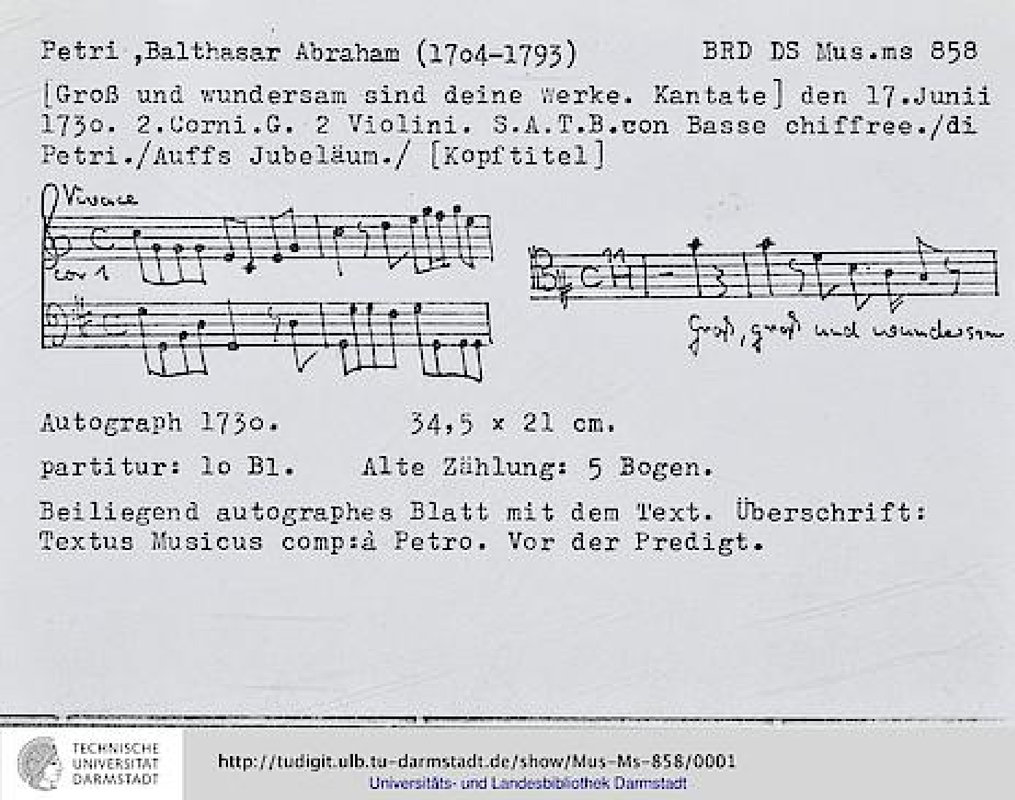 | Instrumentation | SATB, 2 horns, 2 violins, basso continuo |