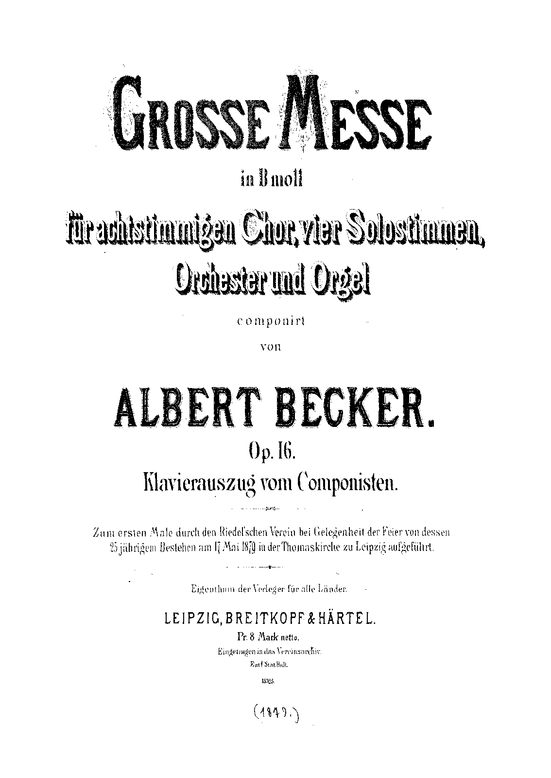 Commissioned for the 25th anniversary of Karl Riedel's Riedel-Verein choir in Leipzig, 1878.