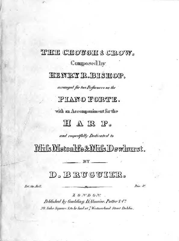 Misc. Notes "... arranged for two Performers on the Piano Forte with an Accompaniment for the Harp, and respectfully dedicated to Miss Metcalfe & Miss Dewhurst by D. Brugier."