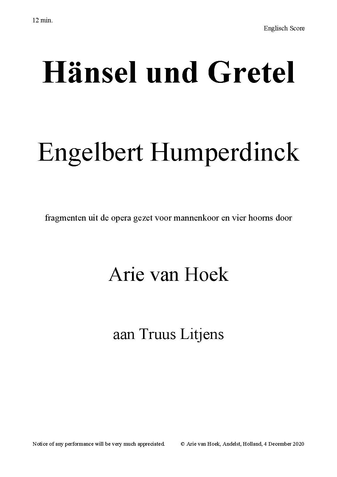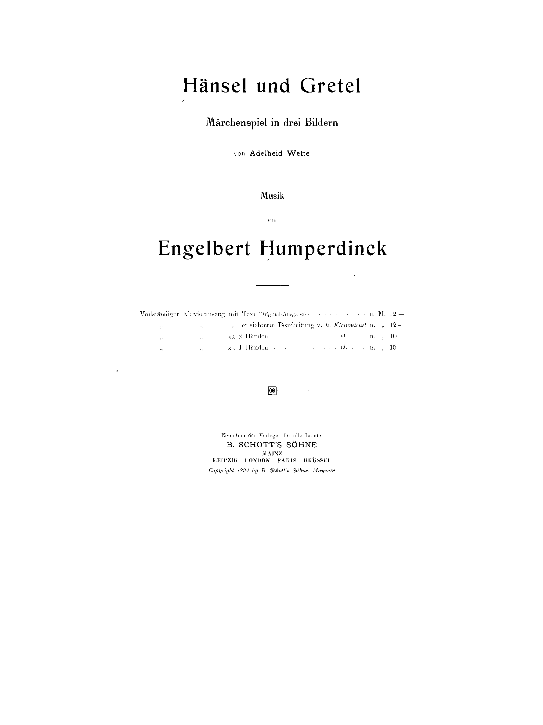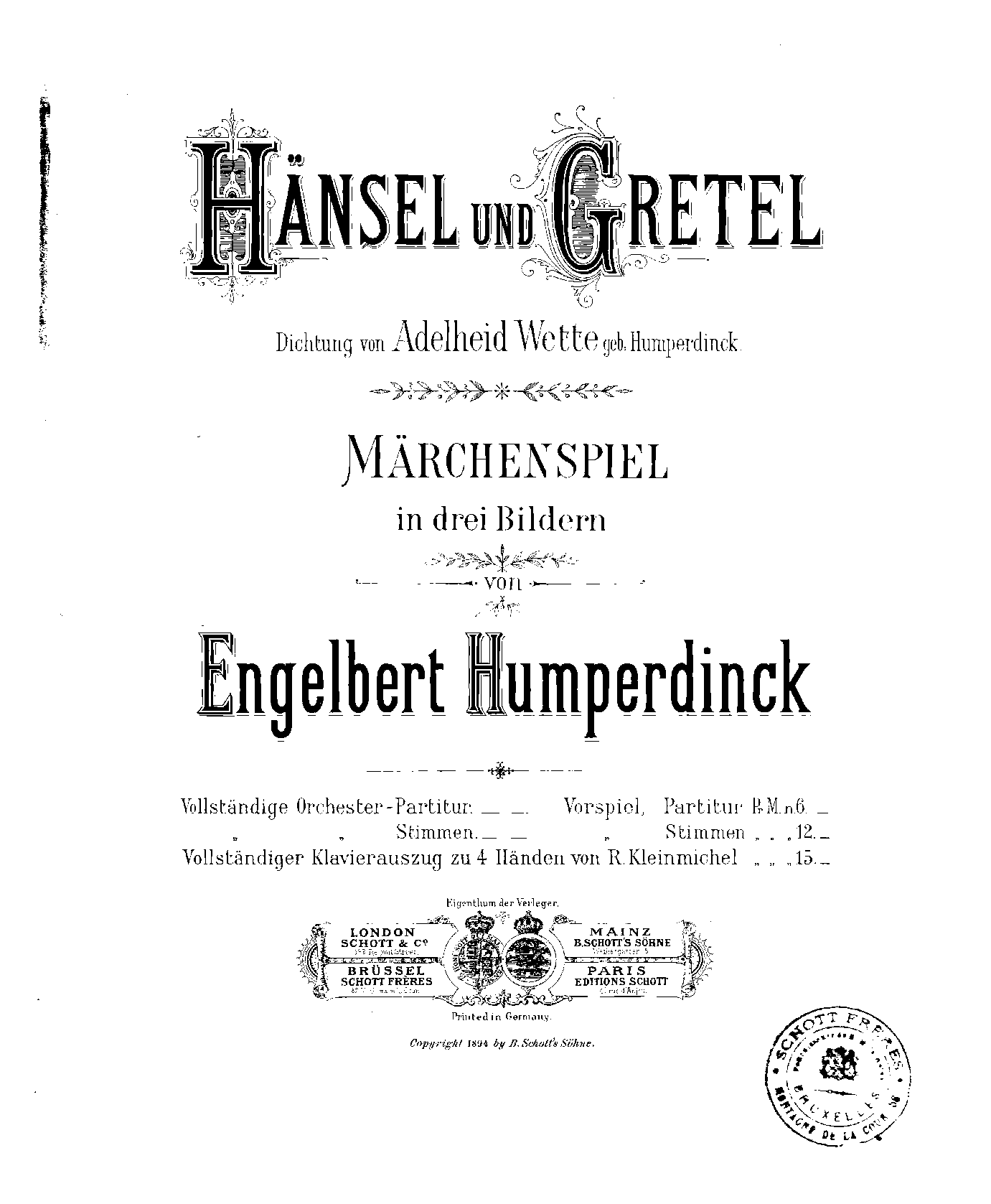 ⇒ 31 more: 2. Suse, liebe Suse • 3. So recht! Und willst du nun nicht mehr klagen • 4. Brüderchen, komm tanz mit mir • 5. Hotta! Himmel, die Mutter! • 6. Da liegt nun der gute Topf in Scherben • 7. Rallalala, rallalala • 8. Ho, Ho! Wer spek-spektakelt • 9. Doch halt, wo bleiben die Kinder? • 10. Eine Hex‘, steinalt • 11. Hexenritt – Ende Akt 1 • 12. Ein Männlein steht im Walde • 13. Kuckuck, kuckuck, Eierschluck! • 14. Gretel, Ich weiß den weg nicht mehr • 15. Der kleine Sandmann bin ich • 16. Abends will ich schlafen gehen • 17. Pantomime • 18. Ouvertüre zu Akt 3 • 19. Der kleine Taumann heiß ich • 20. Wo bin ich - Wach‘ ich • 21. Mir ist so wohl, ich weiß nicht wie! • 22. Bleib stehn, bleib stehn! • 23. Alles bleibt still • 24. Knusper, knusper, knäuschen • 25. Ich bin Rosine Leckermaul • 26. Halt! Hokuspokus, Hexenschuss • 27. Der Teig ist gar, wir können voranmachen • 28. Hurr, hopp, hopp, hopp • 29. Auf, wach auf, mein Jüngelchen • 30. Juchei! Nun ist die Hexe tot! • 31. Erlöst, befreit, für alle Zeit! • 32. Kinder, schaut das Wunder an