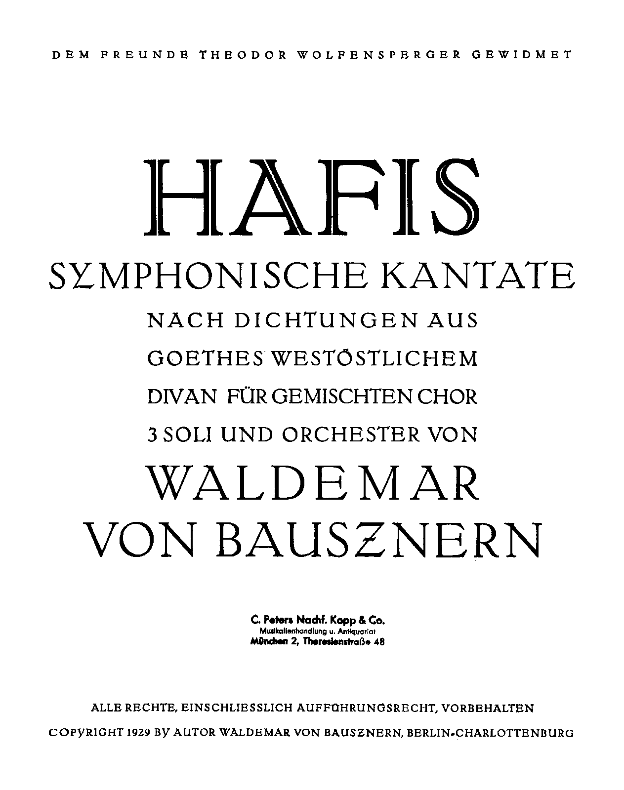 | Alternative. Title | Symphonishe Kantate nach Dichtungen aus Goethes Westöstlichem Divan für gemischten Chor 3 Soli und Orchester |