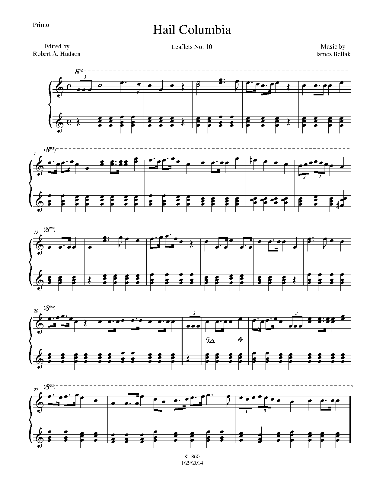 | External Links | Wikipedia article Report on "The Star-Spangled Banner", "Hail Columbia", "America", Yankee Doodle" by O.G. Sonneck, 1909 (p.43) "Hail Columbia" and its First Publication by Charles Henry Hart (1910) The First Edition of "Hail Columbia!" by O.G. Sonneck, 1916 US-BAu (Bellak arrangement) |