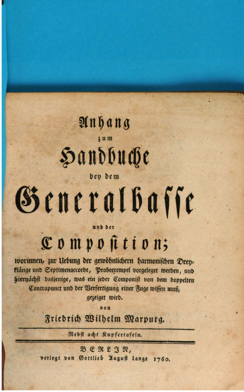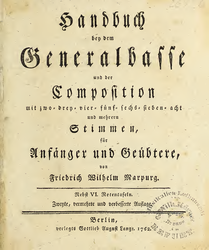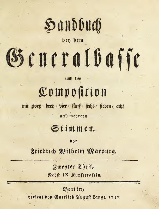Handbuch bey dem Generalbasse und der Composition mit zwo- drey- vier- fuenf- sechs- seiben- acht und mehrern Stimmen, fuer Anfaenger und Geuebtere, von Friedrich Wilhelm Marpurg