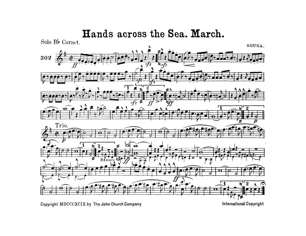 Nearly all of Sousa's marches were issued simultaneously in versions for Band, Orchestra, and Piano solo.