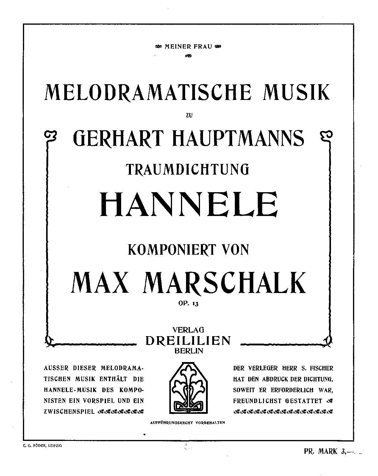 | Alternative. Title | Melodramatic Music to Gerhart Hauptmanns "Hannele" ; Melodramatische Musik zu Gerhart Hauptmanns Traumdichtung Hannele |