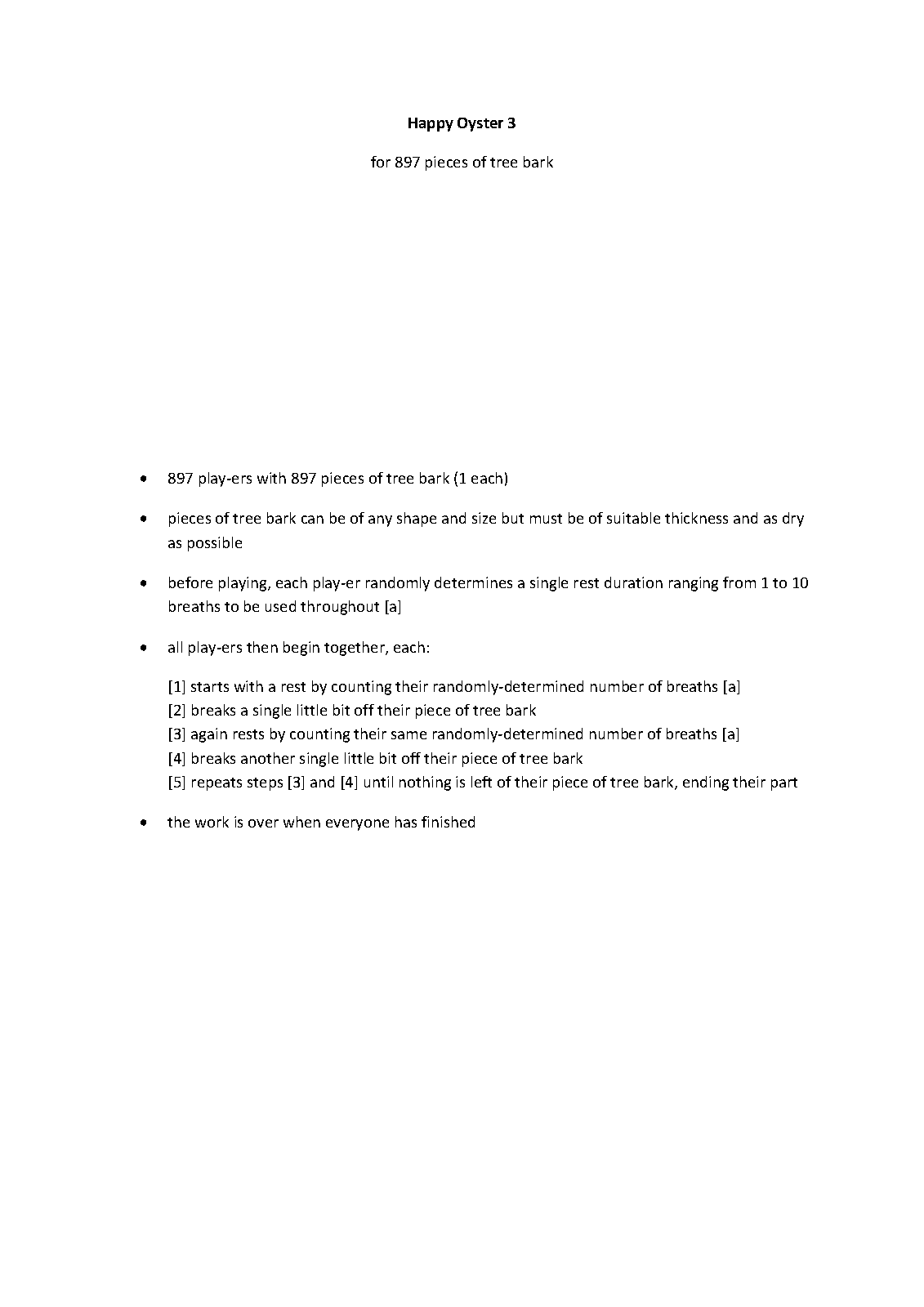| Instrumentation | 897 players with 897 pieces of tree bark (1 each) |