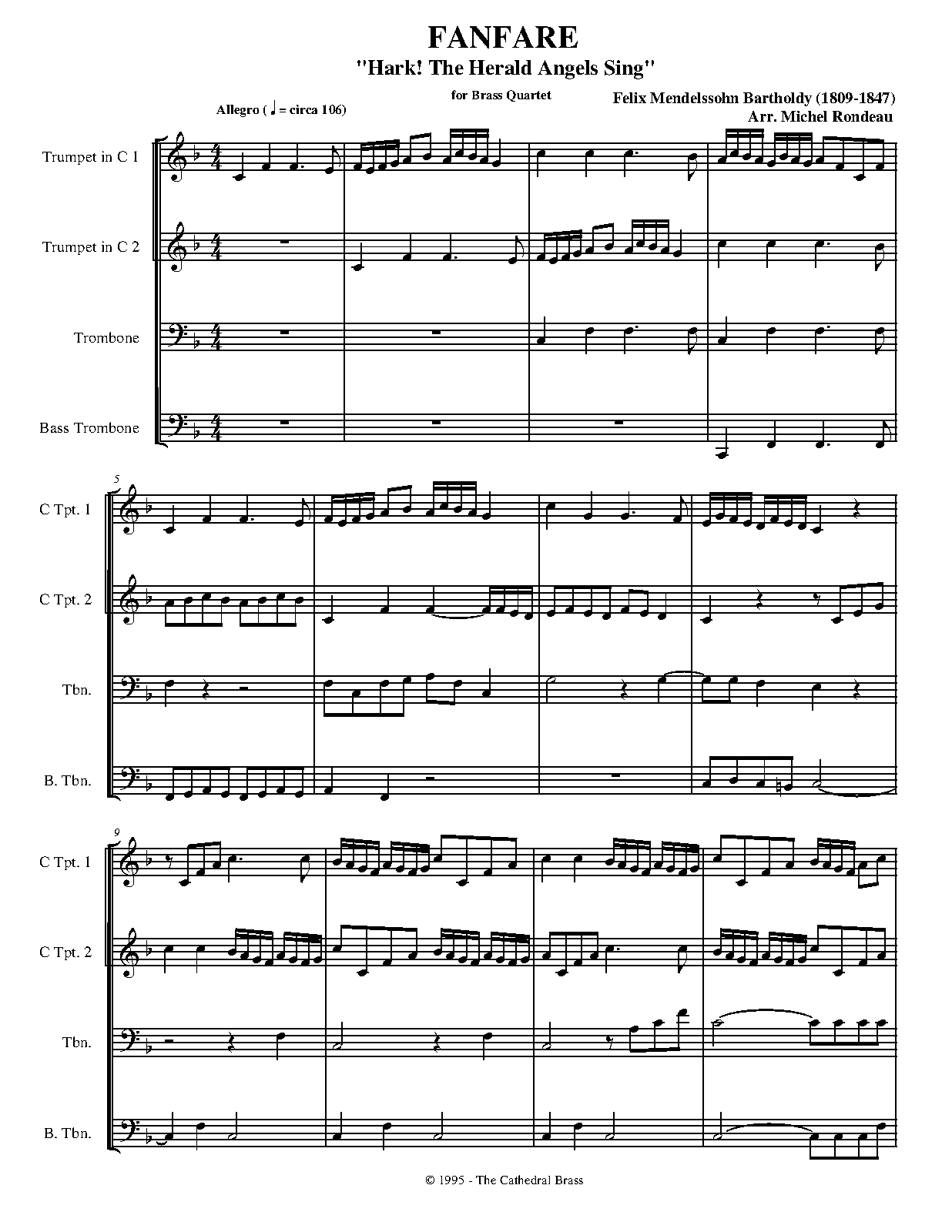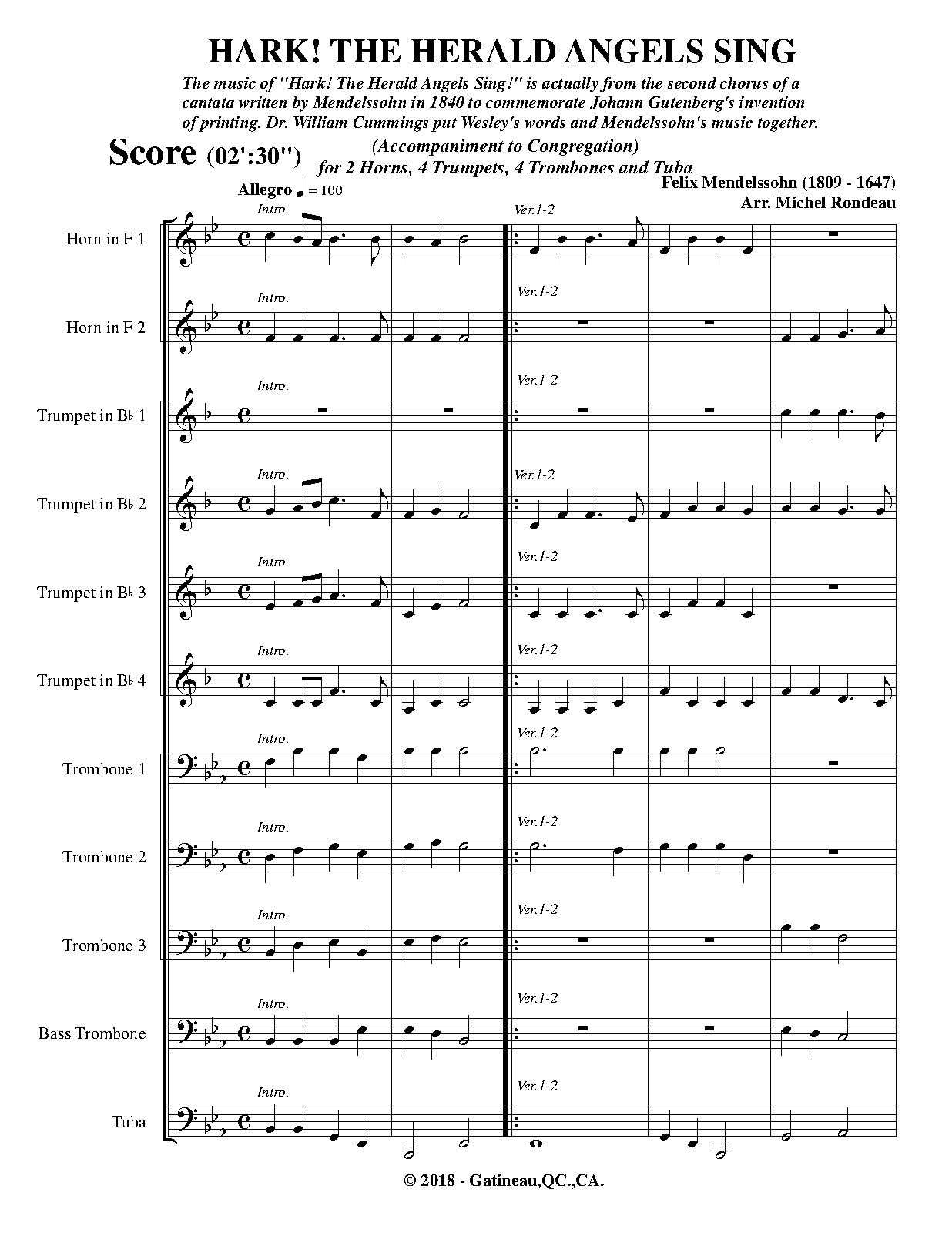 | Extra Information | In 1855 Cummings adapted part of the "Vaterland, in deinen Gauen" section from the Festgesang zum Gutenbergfest, WoO 9, by Felix Mendelssohn (1840), making changes to the rhythm and harmonisation of the original to fit the lyrics of Charles Wesley's "Hark! The Herald Angels Sing" (1754). Wesley intended his words to be sung to the same tune as his hymn "Christ the Lord Is Risen Today" and in some hymnals that tune is included for "Hark! The Herald Angels Sing" along with the more popular Mendelssohn-Cummings tune (see Wikipedia article). |