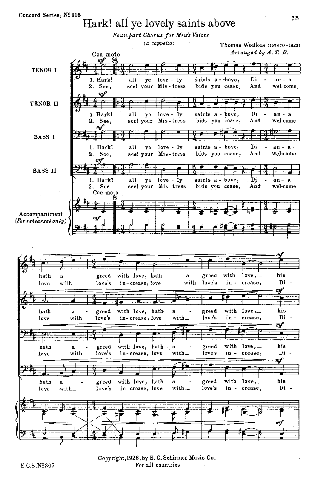 The Concord Series: Harvard University Glee Club Collection of Part Songs for Men's Voices, No.916 Boston: E.C. Schirmer Music Co., 1928. Plate E.C.S. No.307.