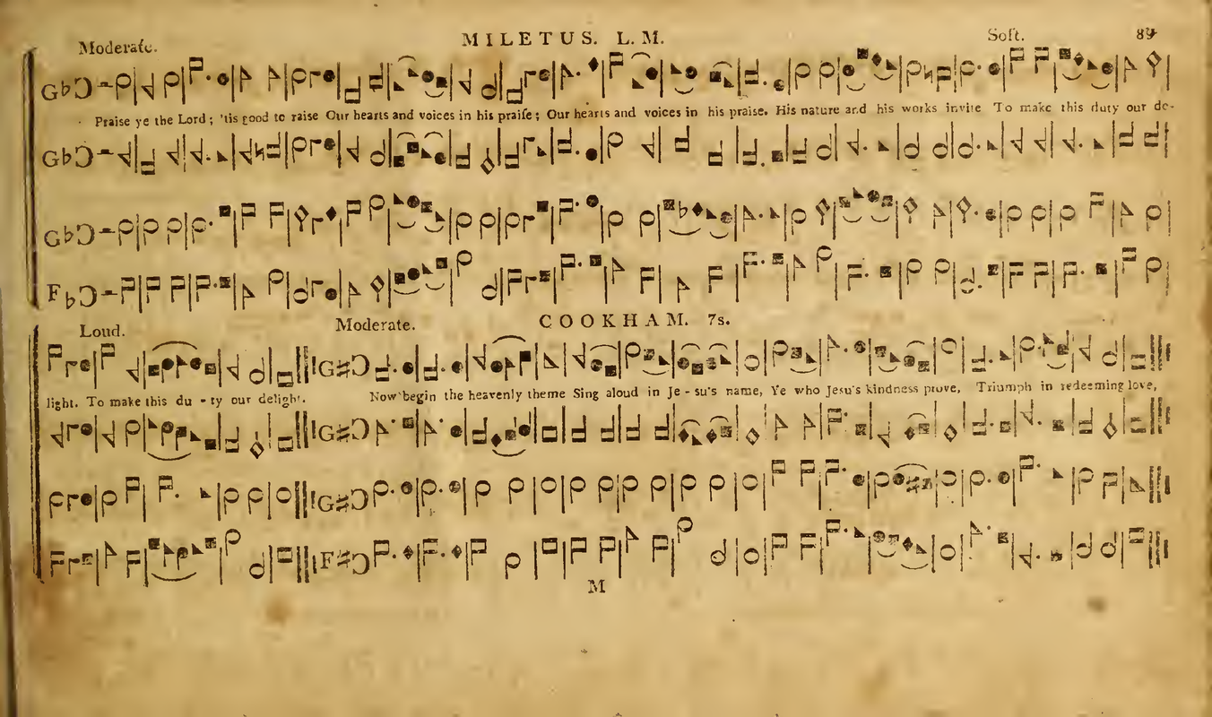 N.B. The 4-shape notation here is Law's own invention, copyrighted in 1803—it differs from the more common 4-shape system that is still in use today (first used in The Easy Instructor) in that the rectangle notehead denotes faw, and the triangle law. In addition, the three repeated shapes in the scale are differentiated with a dot (looking like a staccato dot), making in effect a sort of 7-shape notation (though Law only advocates the 4-syllable solfege). Law's later publications use an updated version this system, copyrighted 1809, where the notes are printed between segments of 5-line musical staff (the earlier system did not use a staff).