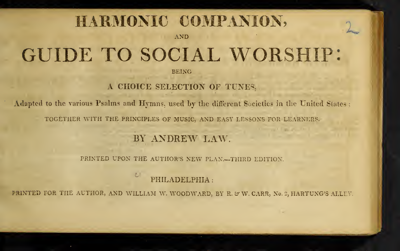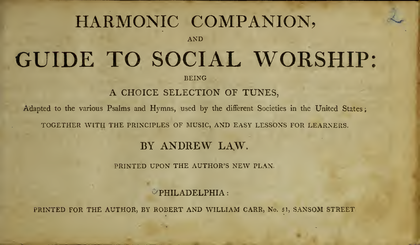 Title page transcription: Harmonic Companion, and Guide to Social Worship: being a choice selection of tunes, adapted to the various Psalms and hymns, used by the different Societies in the United States, together with the principles of music, and easy lessons for learners. By Andrew Law.