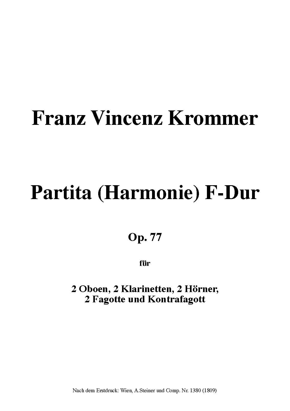 Krommer's 9 partitas for wind nonet (opp.57, 67, 69, 71, 73, 76, 77, 78 and 79) were originally published as "Harmonie". Several manuscript sources listed in RISM, however, use Partitta or Parthia. The modern editions by Musica rara (opp. 57, 67, 69 and 79) dropped the title "Harmonie" using "Octet-Partita" instead, hinting thereby at the possibility to perform the works as octets. While the Contrabassoon improves the sonorities of the ensemble substantially, Bassoon II and Contrabassoon are mostly in octave parallels and only a few bars have a distinct contrabassoon part.