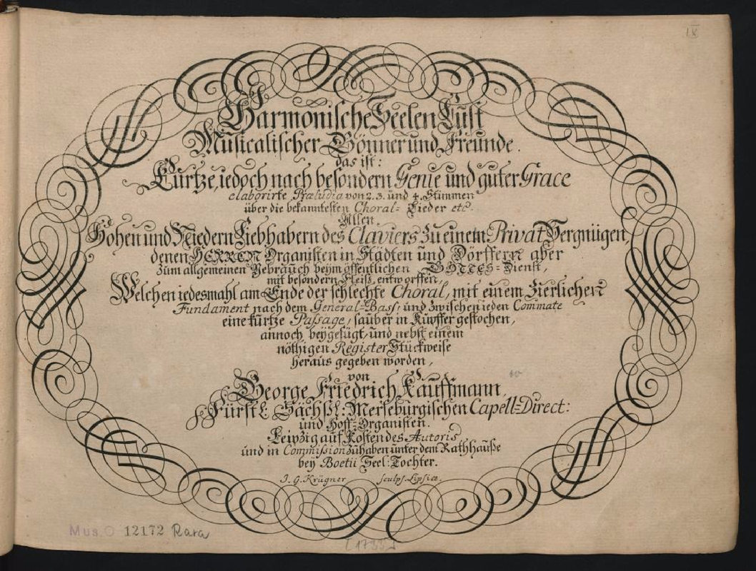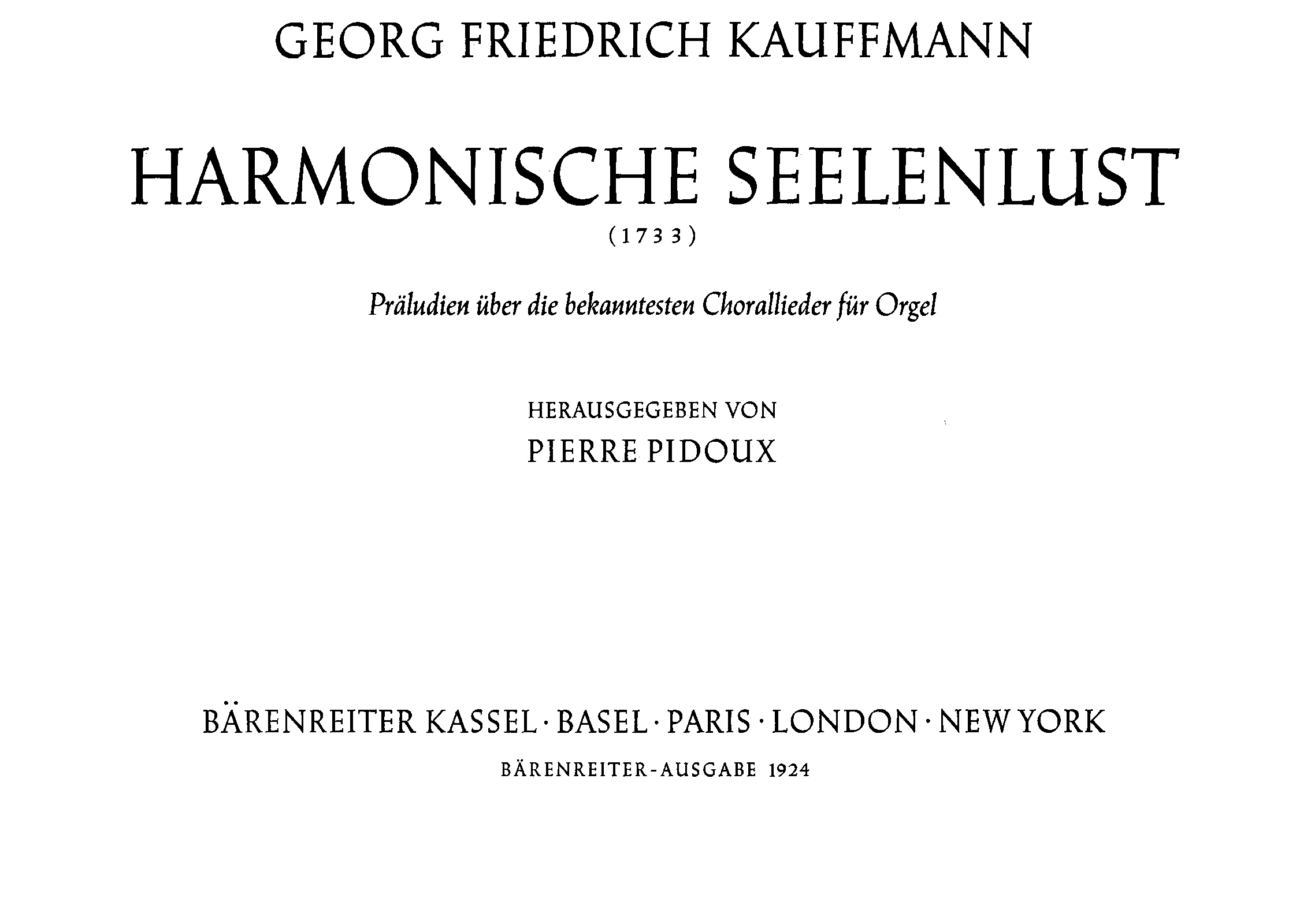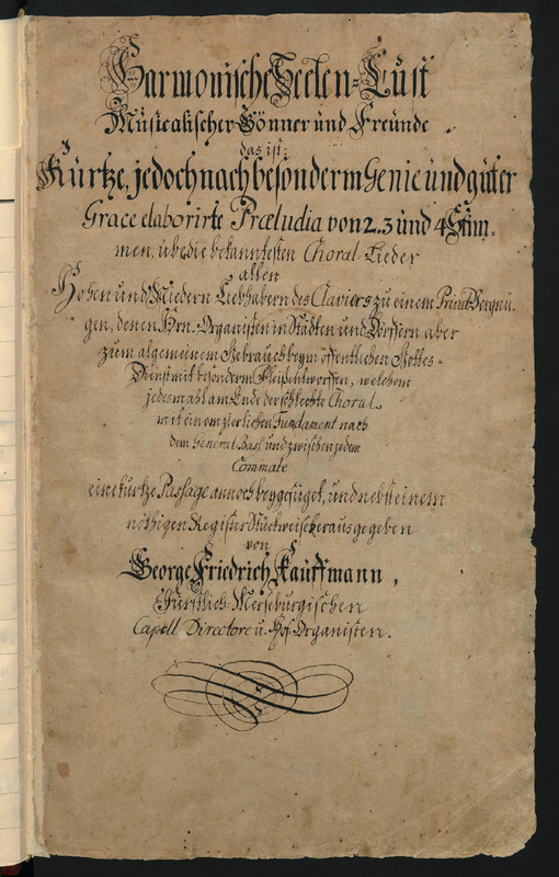 Alternative. Title Harmonische Seelen Lust Musikalischer Gönner und Freunde. das ist Kurtze, iedoch nach besondern Genie und guter Grace elaborirte Praeludia von 2. 3. und 4. Stimmen über die bekanntesten Choral-Lieder etc. Allen Hohen und Niedern Liebhabern des Claviers zu einem Privat Vergnügen, denen Herren Organisten in Städten und Dörffern aber zum allgemeinen Gebrauch beym öffentlichen Gottes-Dienst, mit besondern Fleiß entworffen, Welchen iedesmahl am Ende der schlechte Choral, mit einem Zierlichen Fundament nach dem General-Bass, und zwischen ieden Commate eine kurtze Passage, sauber in Kupffer gestochen, annoch beygefügt, und nebst einem nöthigen Register Stückweise heraus gegeben worden von George Friedrich Kauffmann