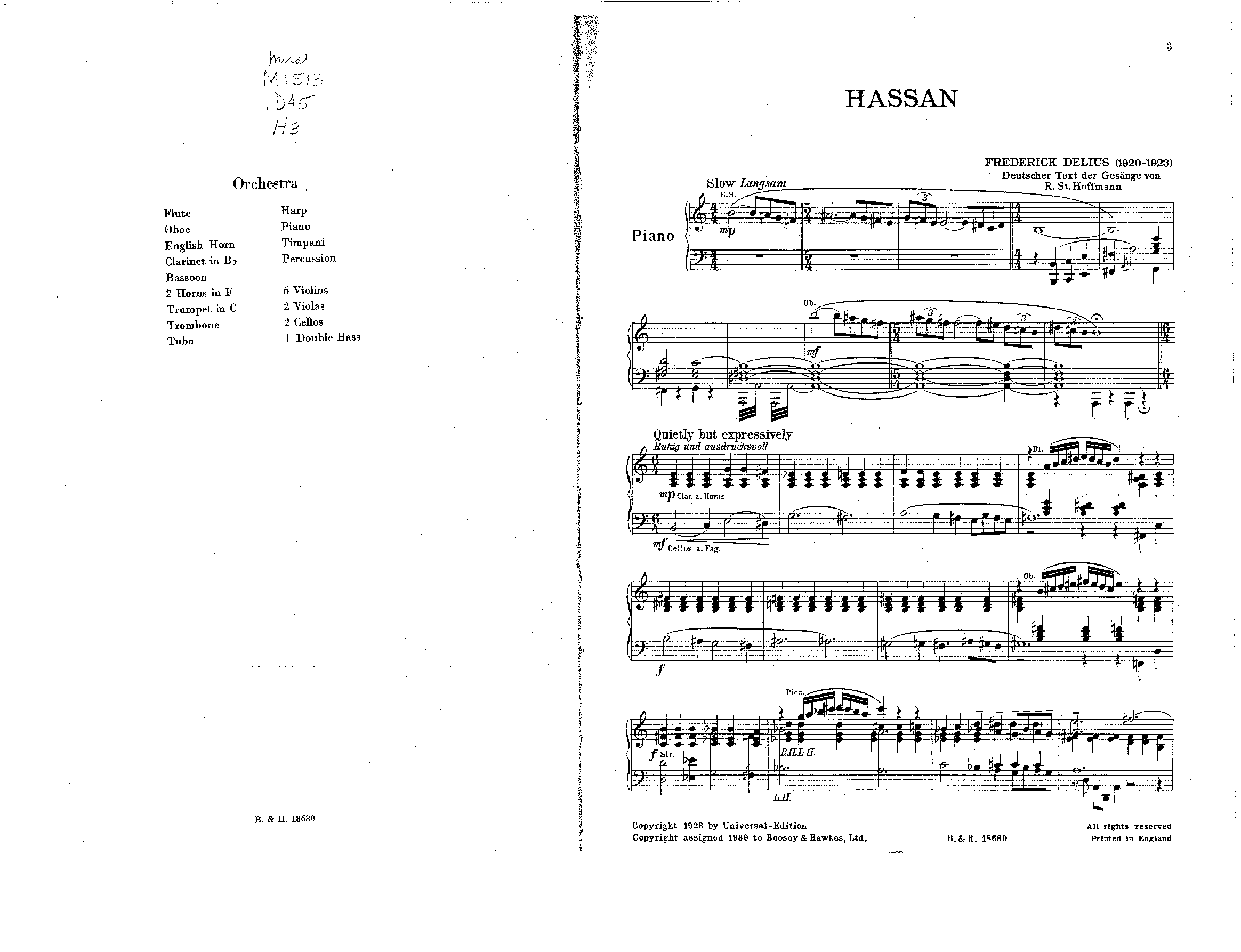The play Hassan was the last work of writer James Elroy Flecker (1884-1915). Its full title is Hassan: The Story of Hassan of Baghdad and How he Came to Make the Golden Journey to Samarkand. A production in London's West End was planned immediately after Flecker's death, but those plans foundered due to the war. The play was not published until 1922, and Delius wrote this incidental music for the play's first production, in 1923.