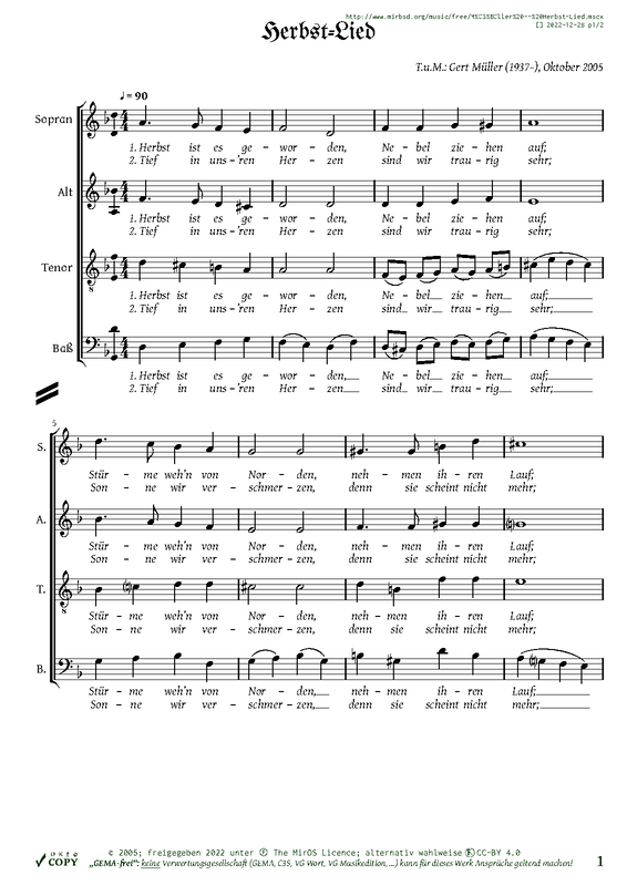 | Extra Information | The composer, Gert Müller (of “rock and walker show” and “forest and meadow choir” fame), came to the inspiration of this poem in autumn of 2005, during a stroll about nature. He wrote it down as soon as possible and set it to music shortly thereafter. Enjoy singing! |