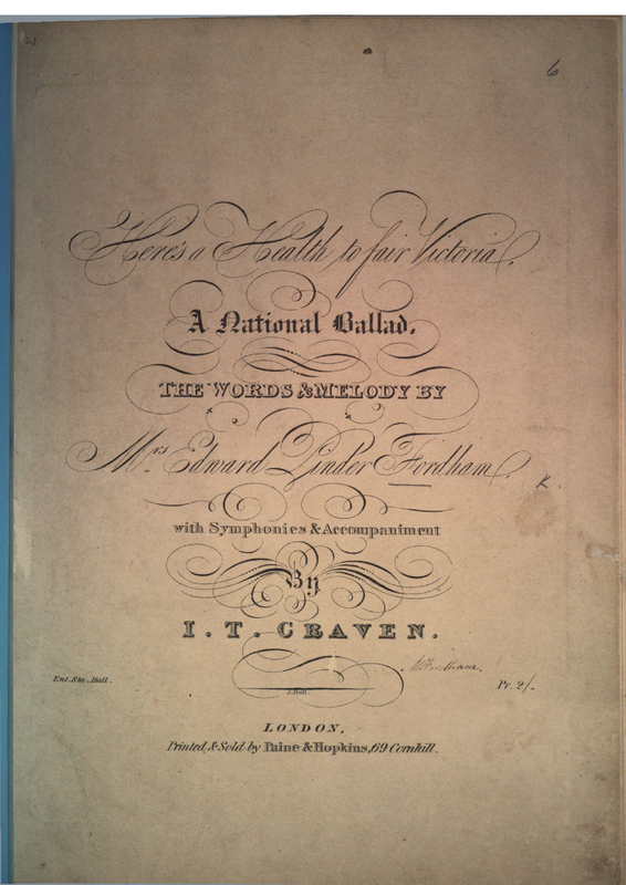 | Alternative. Title | Here's a Health to fair Victoria, a National Ballad, the words and melody by Mrs Edward Pinder Fordham, with Symphonies & Accompaniment by J. T. Craven |