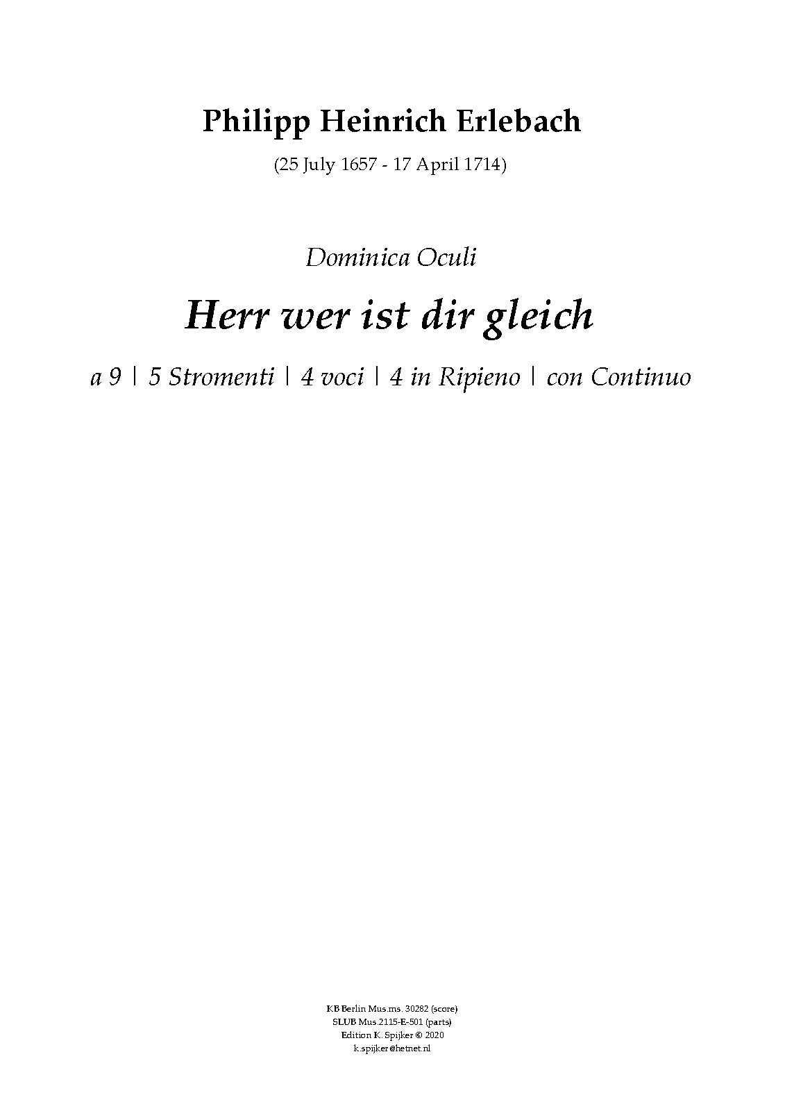 Voices: soprano, alto, tenor, bass; mixed chorus (SATB) Instruments: 2 violins, 2 violas, continuo