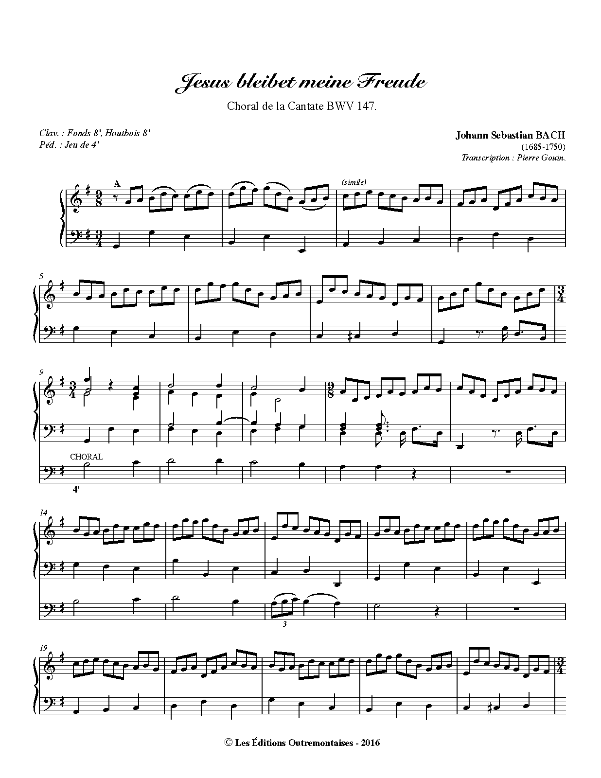 Misc. Notes Version in Bach style (Schübler Chorales) in trio, chorale melody at the pedal, transposed in F Major for historical 26-key pedalboards.