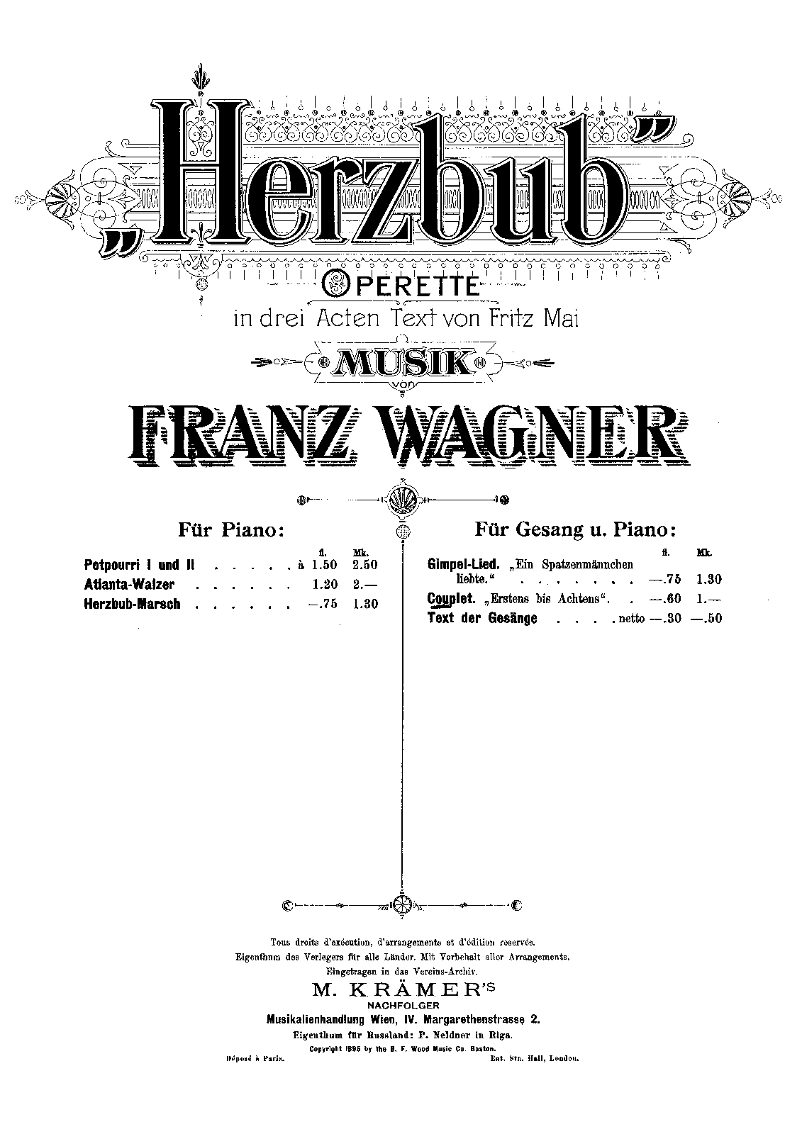 | Extra Information | Many sources attribute this operette to J.F. Wagner (1856-1908), but period sources make a clear distinction between the two composers: e.g. Neuer Theater-Almanach für das Jahr 1896 (p.97) lists Franz Wagner (including birth data: Wien, 23. Aug. 53 !) as composer of Herzbub, and J.F. Wagner as composer of other work. |