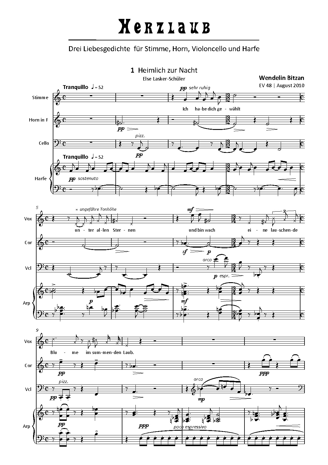 Herzlaub for voice, horn, cello and harp