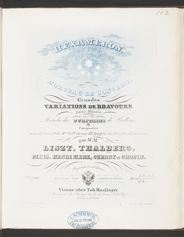 Alternative. Title Morceau de Concert (Grandes Variations de Bravoure pour Piano sur la Marche des Puritains de Bellini, composées pour le Concert de Mme la Princesse Belgiojoso au Benefice des pauvres, par MM Liszt, Thalberg, Pixis, Henri Herz, Czerny et Chopin)