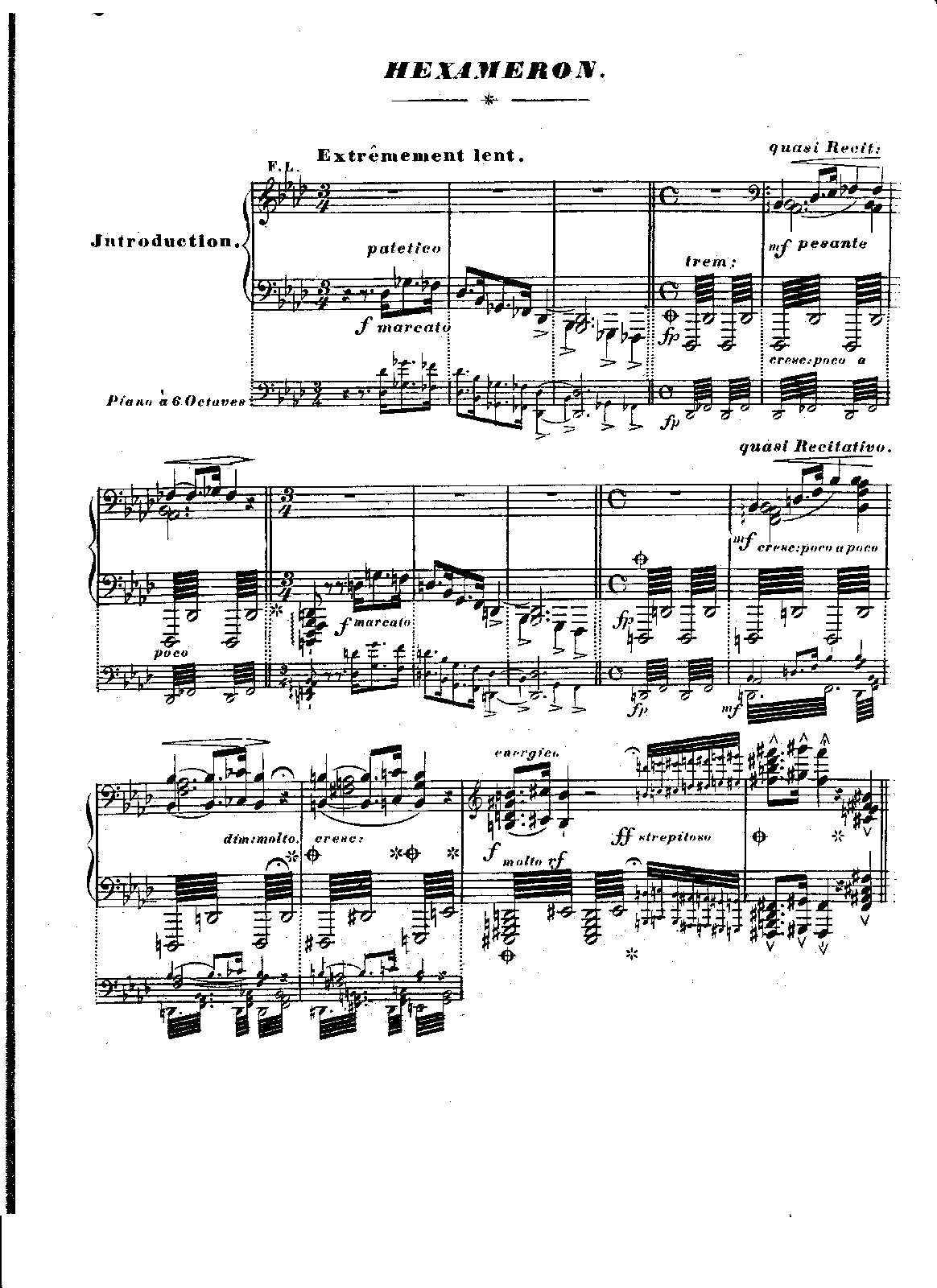 Name Aliases Hexaméron, Morceau de concert; Hexaméron, S. 392; Hexaméron (Grande variations sur le march des I Puritains), collaborative work for piano, S. 392 (LW A41) (after Bellini); 6 variations on the march from Bellini's I Puritani; Grandes variations de bravoure sur la marche des Puritains de Bellini; Morceau de concert; Six variations on the march from Bellini's I Puritani; Variations on the march from Bellini's I Puritani